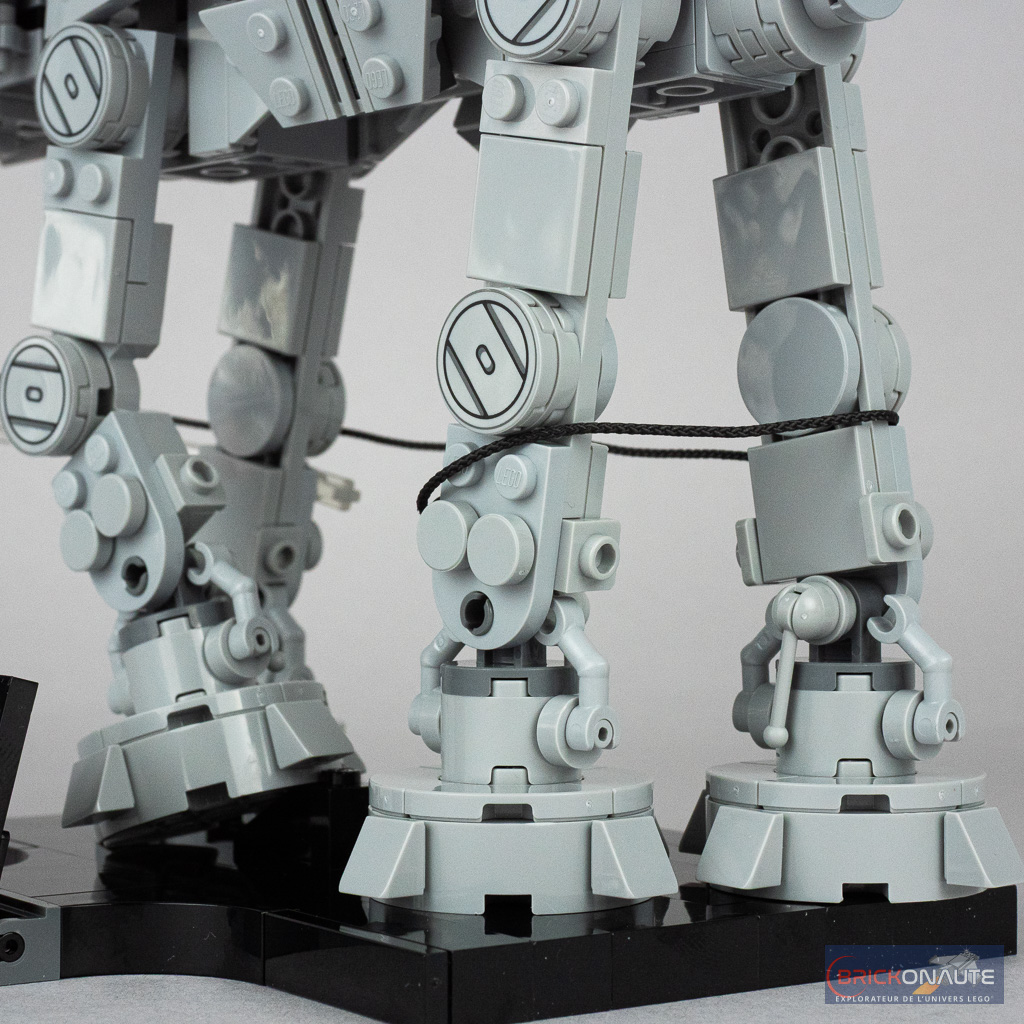 On construit ensuite les 3 premières pattes, identiques, fixées au corps par des pins, puis on attache l’engin sur son support d’exposition par des pins également. On construit alors la dernière patte pliée au niveau du genou puis le micro Snowspeeder en train d’enrouler le câble autour des pattes de l’AT-AT.