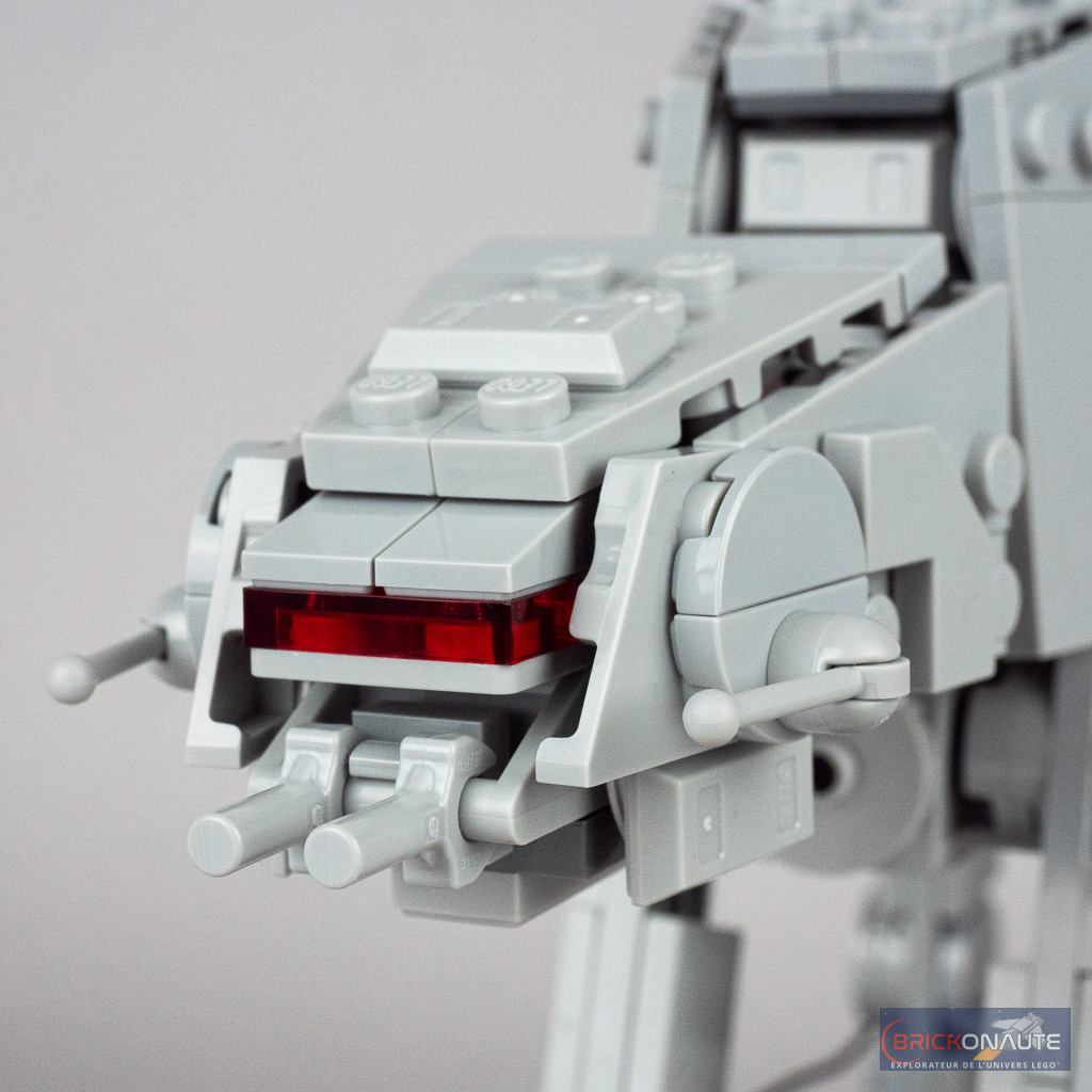 Le niveau de détail me semble également plus que satisfaisant avec un joli travail à tous les niveaux, depuis les articulations des pieds jusqu’à la tête de la machine et son poste de pilotage rouge translucide et ses canons. Seul défaut notable, assez peu visible sur mes photos mais bien plus en vrai : on remarquera des différences de teinte entre certains éléments gris de la carlingue.
