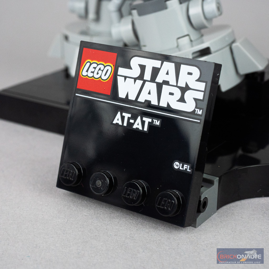 La pose est dynamique et on pourra orienter la tête – seul élément mobile de la construction. Le petit snowspeeder, minimaliste et composé de seulement quelques pièces, semble réellement « flotter » sur sa tige transparente, et le câble qu’il tire rappellera aux fans la célèbre scène de L’Empire Contre-Attaque. Le support noir lisse et la plaque de présentation apportent un petit côté premium.