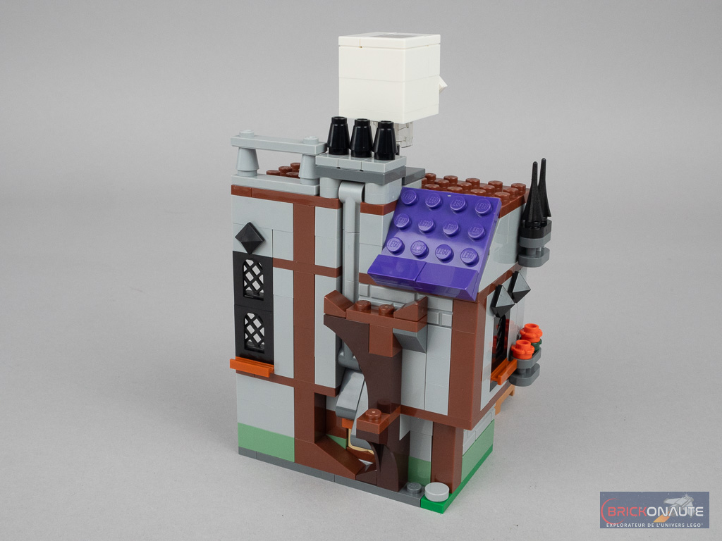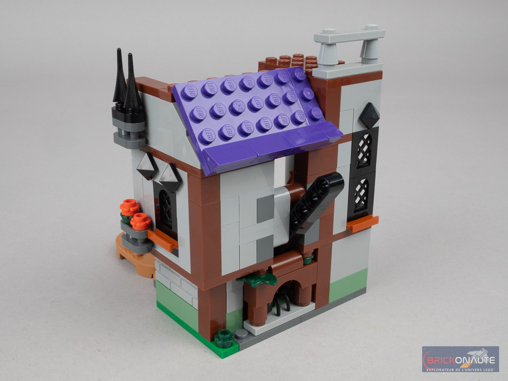 Le design est assez simple mais plutôt réussi. J’aime particulièrement ces murs qui s’écartent de la structure, en encorbellement, et les pièces marron qui forment les poutres et les planchers de la structure en entourant le gris des murs. Les fenêtres sout habilement soulignées de pièces dark orange et les toits violets viennent contraster avec le reste de la construction. Quelques petits détails comme des demi-diamants noirs, des cheminées ou des rambardes apportent une finition appréciable.