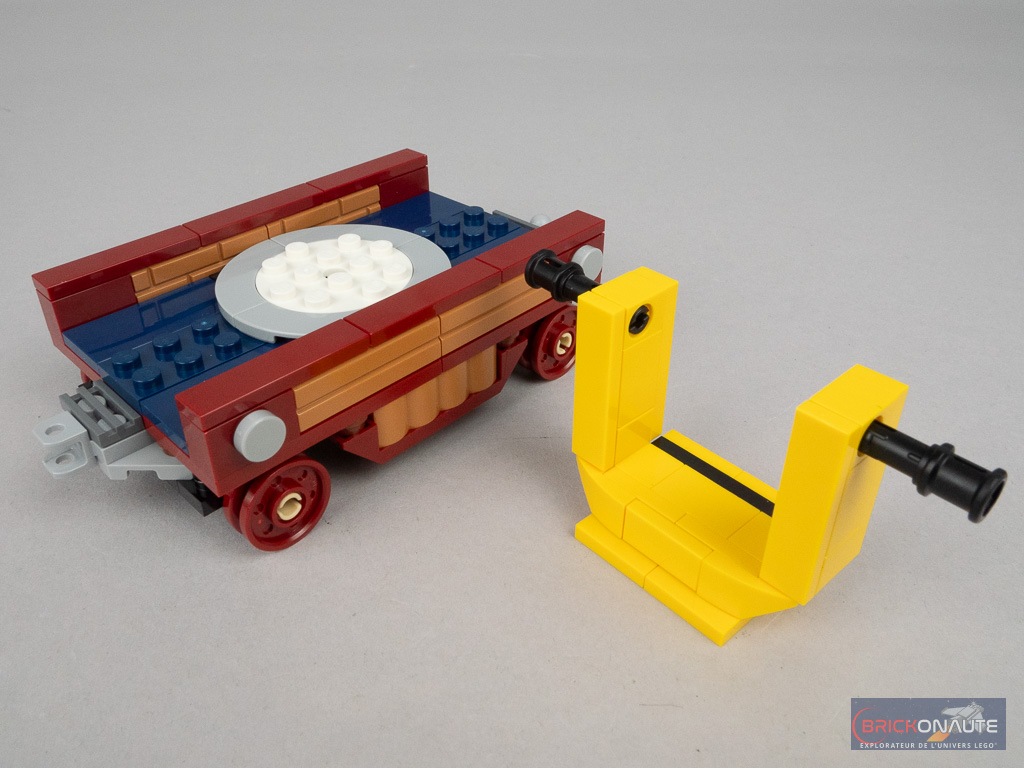 Je ne vais pas rentrer ici dans le détail du processus de construction – je vous ai préparé une galerie de photos complète que vous retrouverez à cette adresse. Assez logiquement, le processus se décompose par éléments : on commence par la petite gare et le canon de départ, avant d’assembler, les uns après les autres, les différents wagons pour terminer par la locomotive. Cette dernière nécessite les pièces de 7 des 13 sachets fournis, c’est donc un gros morceau.