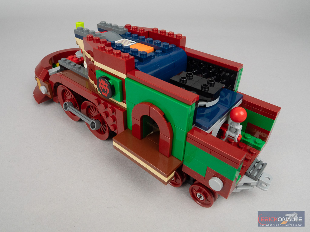 La locomotive, élément phare de cette boîte, est impressionnante avec son immense tête de Bowser et le gros dôme gris qu’elle tient entre ses dents. Le niveau de détail est tout à fait satisfaisant, depuis la chaîne grise autour du « cou » du gros méchant jusqu’aux roues et à la partie avant, décorée de quelques éléments dorés.