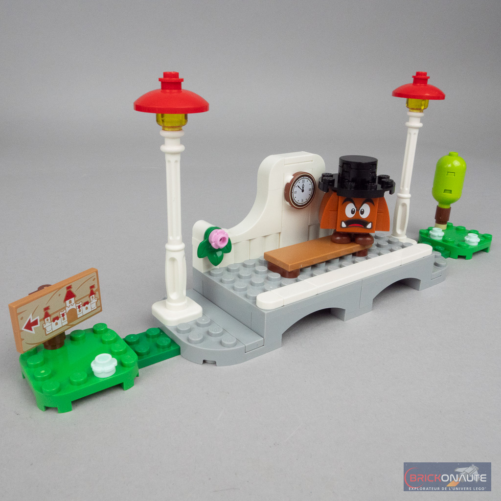 Deux petites constructions annexes sont également proposées avec un morceau de gare, sa petite horloge et son banc ; et un canon orientable qui fait office de départ pour les figurines interactives si on en possède une. Ces deux ensembles disposent chacun d’un panneau indicateur tampographié indiquant d’un côté le château de Peach, et de l’autre celui de Bowser.