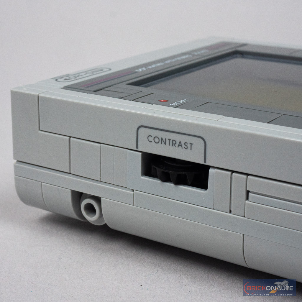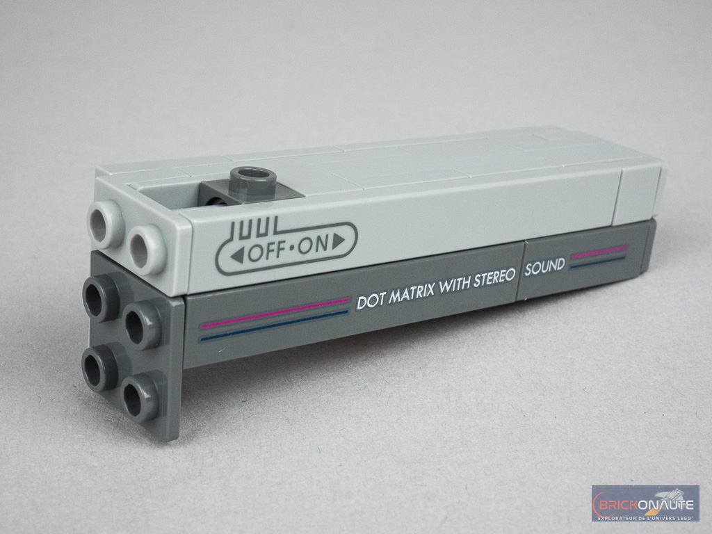 Le feeling est assez extraordinaire une fois la console en main : la conception des boutons, souple, permet de leur offrir un vrai retour. L’interrupteur marche-arrêt (qui coulisse sur un pin Technic) est « fonctionnel » et produit un petit clic très agréable, et les molettes de volume et de contraste tournent, reproduites avec des engrenages. L’insertion des cartouches dans la console vient se « bloquer » comme dans la vraie. Et la prise du casque vient s’insérer dans le support d’exposition.