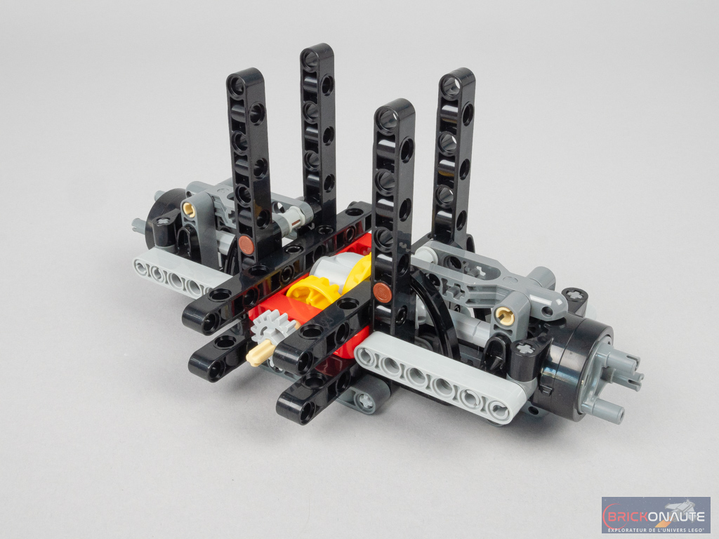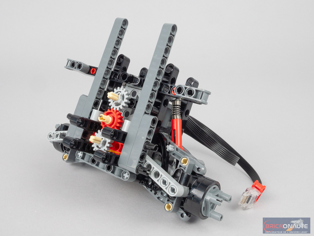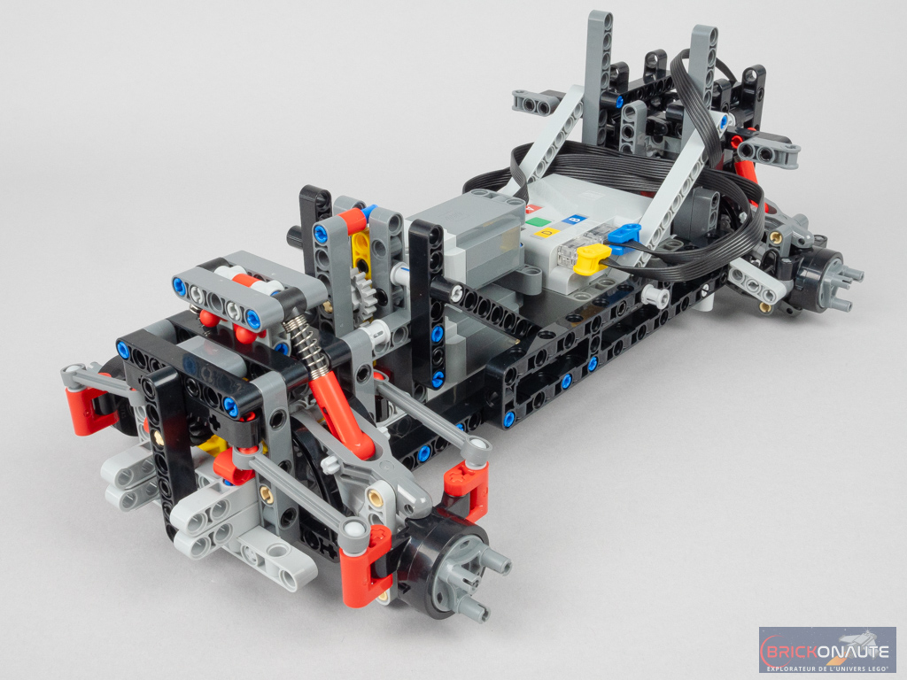 bon jour c’ est pour savoir qui connait un set lego avec le meme type de châssis (Nous démarrons la construction avec l’intérieur de la partie avant de la voiture, avec deux moteurs superposés. Le premier entraîne les roues, tandis que le second est dédié à la direction. On installe évidemment les engrenages (dont un différentiel) et crémaillères nécessaires (notez les deux crémaillères pour la direction – assurant une certaine solidité mais ne permettant pas de réduire le rayon de braquage). On ajoute également les deux amortisseurs, et on construit une structure rigide autour de tout ça)