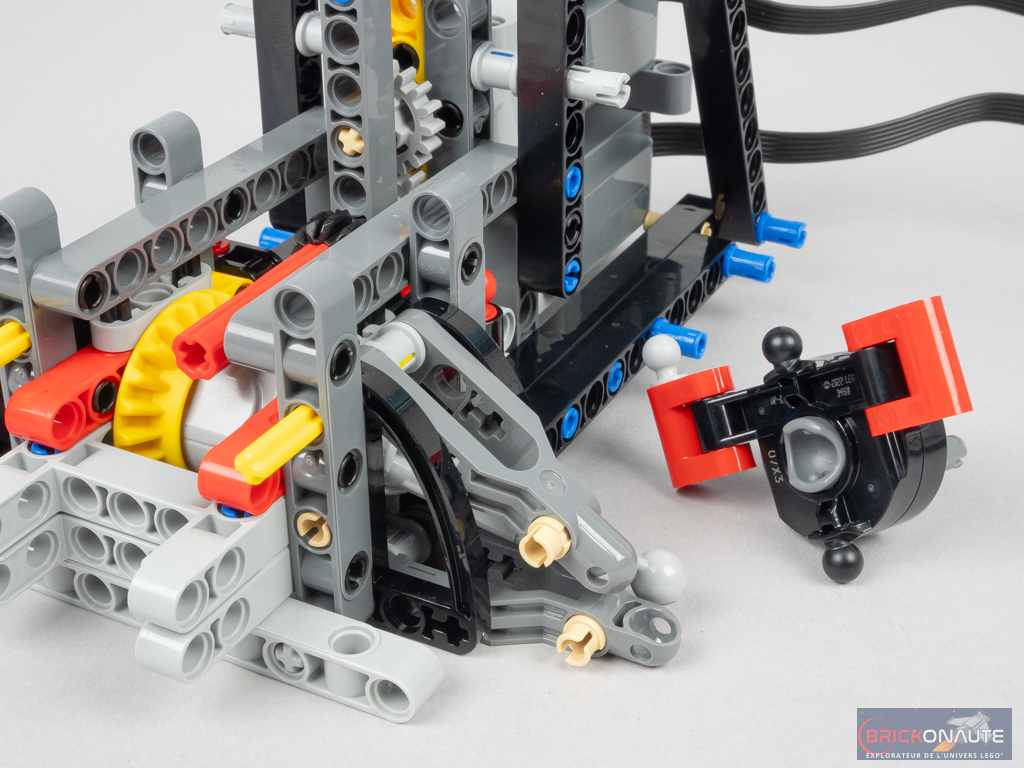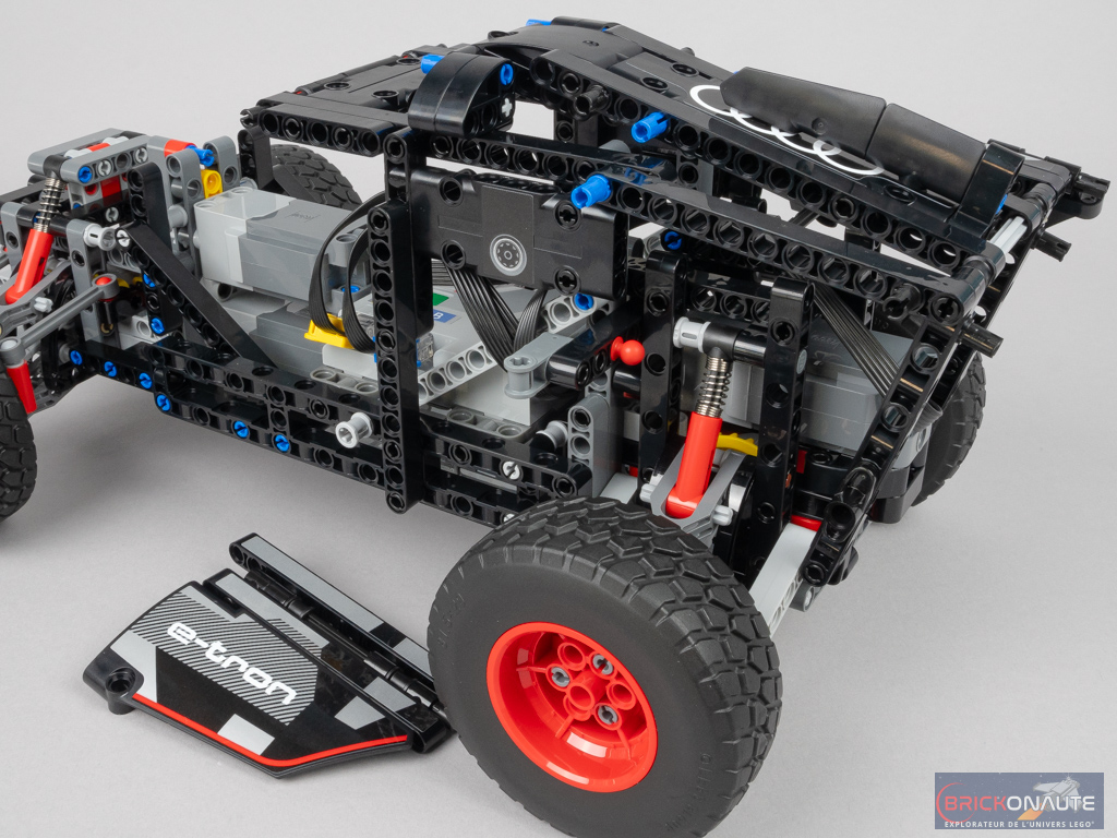 J’aurais par contre aimé trouver des feux brick-built – surtout sur un engin de cette taille : 37cm de long malgré tout – leur absence s’expliquant probablement par la nécessite de n’avoir aucun élément fragile / saillant pour une voiture télécommandée. Autre regret concernant le design, un petit « gap » de quelques millimètres se forme au niveau du capot, c’est un peu dommage. Et les pins bleus sont bien visibles, mais c’est le lot de toute la gamme LEGO Technic.