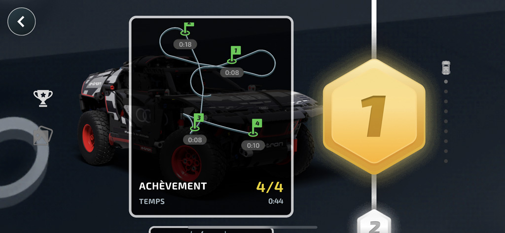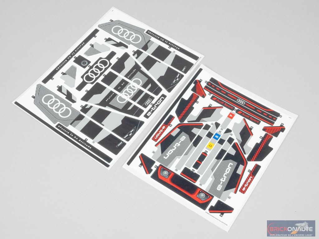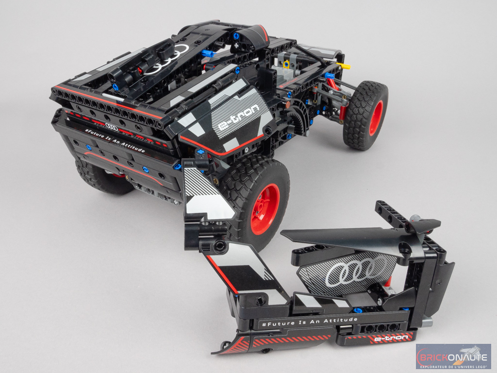 À ce stade, la partie « technique » est terminée et le modèle possède déjà toutes ses fonctions – on pourra s’amuser à le tester ainsi. Les étapes suivantes, qui s’étalent sur les sachets portant les numéros 3 et 4, sont dédiées à l’assemblage de la carrosserie. Certains assemblages sont particulièrement bien pensés pour reproduire les formes du véhicule de référence et globalement, la construction est plutôt distrayante. Si ce n’est pour appliquer l’ensemble des autocollants dont la voiture est littéralement couverte, sans compter qu’il faudra veiller à les aligner correctement pour un rendu optimal.