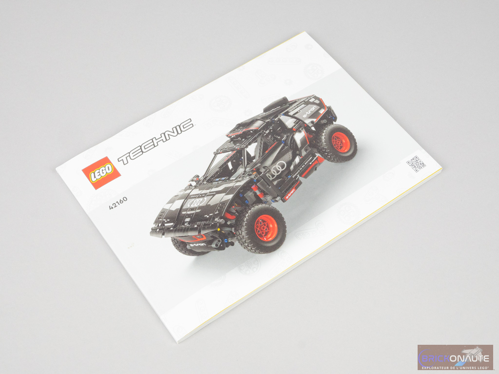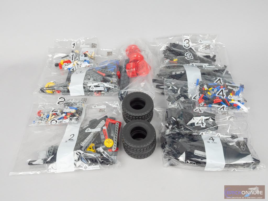 À l’intérieur de la boîte, on trouve 9 sachets de pièces numérotés de 1 à 4, un 10ème sachet non numéroté, et 4 pneus en vrac. Une petite boîte en carton contient le hub / boîtier à piles CONTROL+, et les 3 moteurs sont dans des sachets individuels. Enfin, une pochette en carton contient la notice de 208 pages et 2 énormes planches d’autocollants pour 47 stickers au total – ça promet ! Dommage que la notice ne propose pas quelques pages de présentation du modèle de référence.