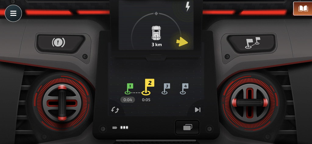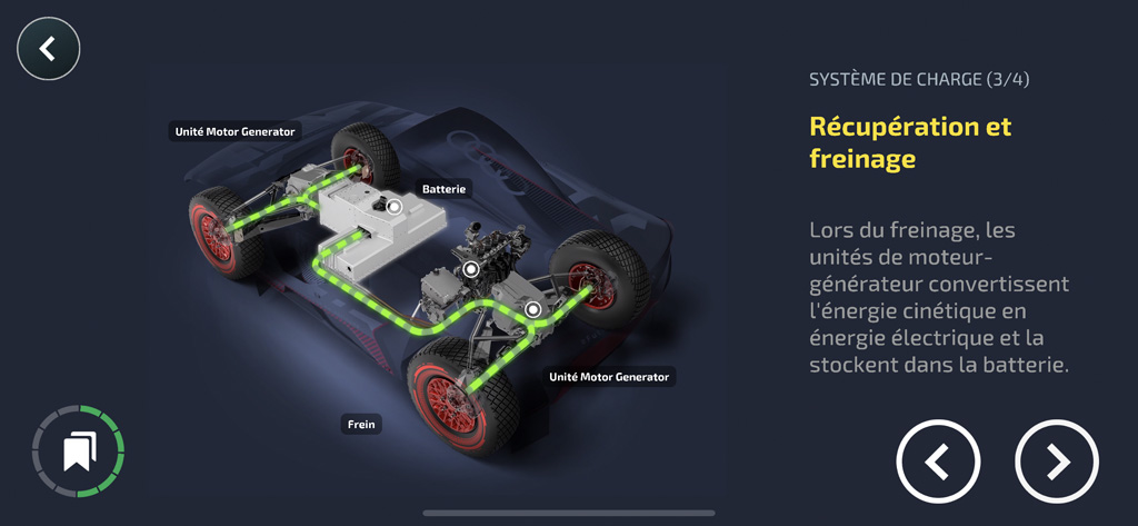 L’application dispose également de tout plein d’informations sur le véhicule de référence et son fonctionnement hybride, et d’un petit mode « rallye » consistant à suivre une flèche pour passer par des checkpoints virtuels. On trouve aussi tout plein de statistiques avec le temps d’utilisation, la distance (virtuelle) parcourue… et une courbe au centre de l’écran qui simule la récupération d’énergie au freinage. Tout ça pour dire que l’application est plutôt bien faite et complète.