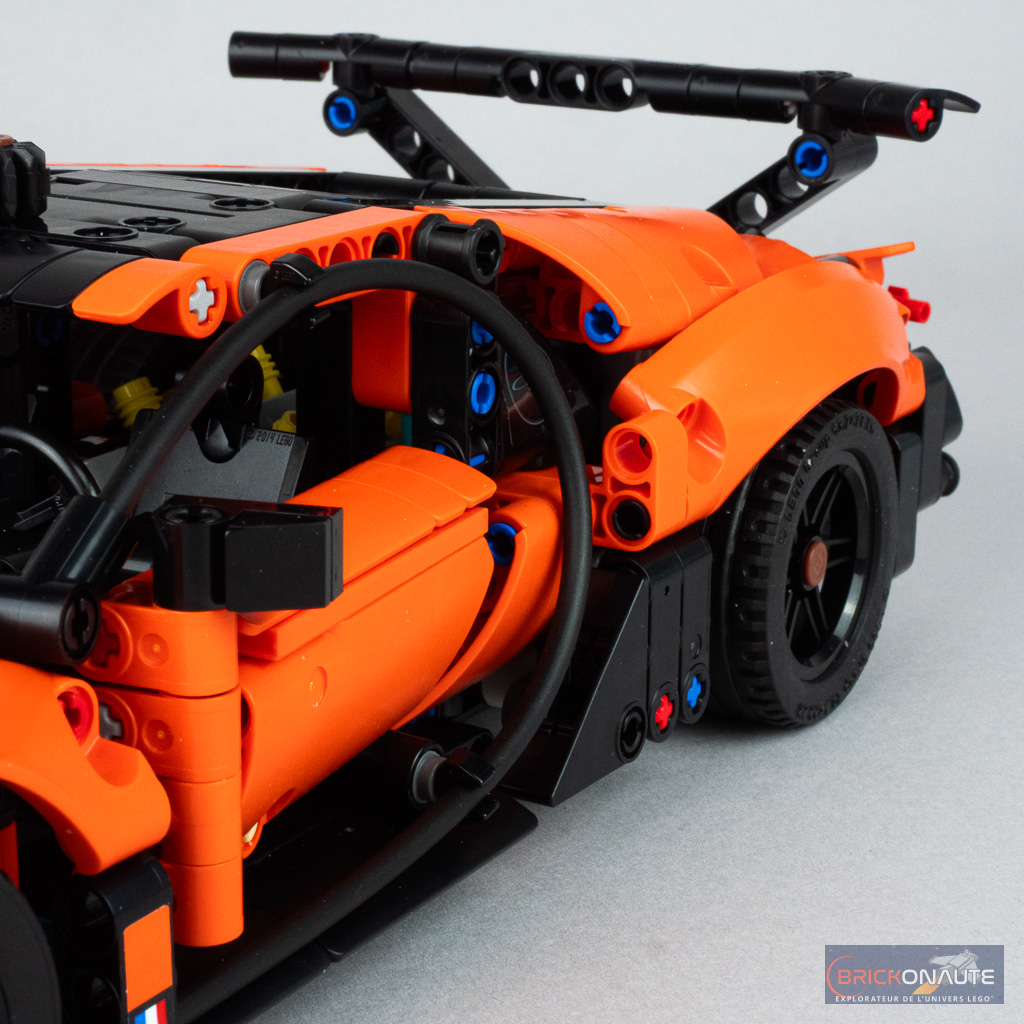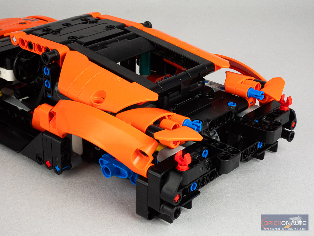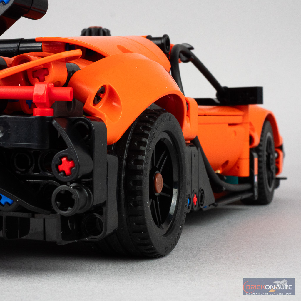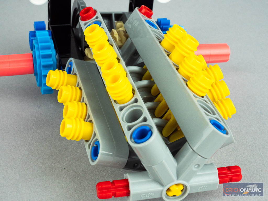 L’autre fonction principale, c’est l’entraînement du moteur W16 par les roues arrières, par l’intermédiaire d’un différentiel. L’utilisation des éléments de moteurs introduits chez LEGO en 2025 permet précisément d’intégrer ce W16 et sa réalisation est simple mais suffisante. Je regrette juste que le designer n’ait pas prévu la possibilité d’ouvrir l’arrière de la voiture pour pouvoir mieux l’observer – il reste malgré tout bien visible depuis la lunette arrière.