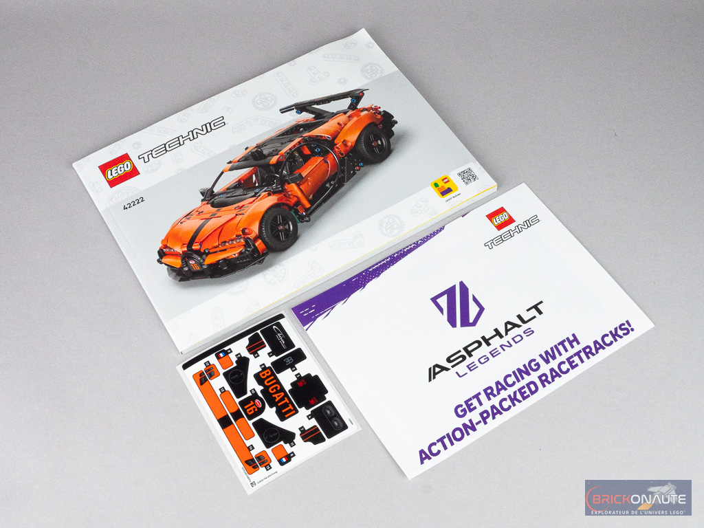 La boîte nous propose une jolie mise en scène de la voiture dans un paysage montagneux – une mention dans la partie inférieure droite nous indique qu’elle est jouable dans le jeu vidéo Asphalt Legends. À l’intérieur, on trouve 5 sachets de pièces numérotés, 3 tiges souples en vrac, une notice d’instructions, une (petite) planche de stickers et un dépliant avec un code pour débloquer la voiture virtuelle.