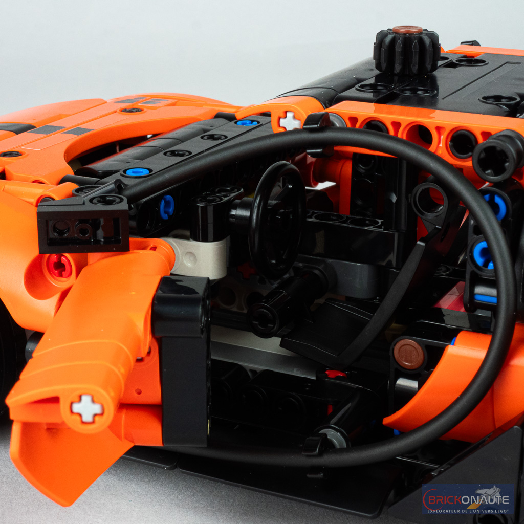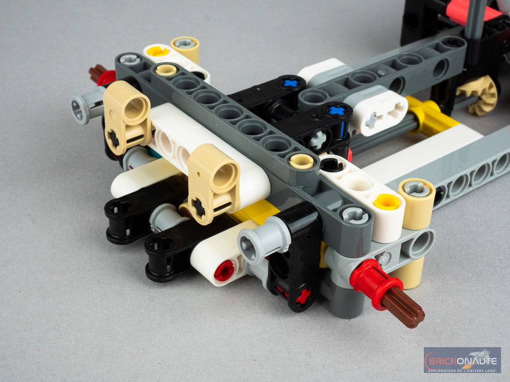 Comme souvent dans la gamme LEGO Technic, la construction commence justement par les éléments… techniques. Après avoir assemblé une partie du châssis, on construit précisément le moteur et son différentiel qui sera relié aux roues arrières. À l’avant du châssis, c’est le système de direction qui prend place avec un système simple de crémaillère renvoyé vers la Hand of God (HOG – qui permet de manipuler la direction depuis le toit de la voiture). Le volant est fixe et non fonctionnel, il est de toute façon difficilement accessible.