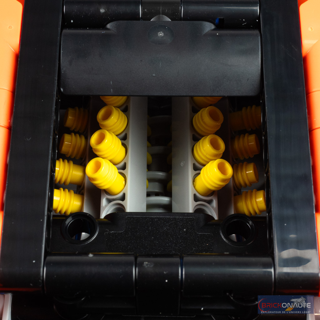 Au-delà de la grande variété de pièces reddish orange, dont de très nombreux panels apparaissant ici pour la première fois dans cette couleur, on remarquera ici la présence des nouveaux éléments de conception des moteurs introduits en 2025 : des cylindres monoblocs, clipsés sur des éléments circulaires excentriques. Et il y en a beaucoup de ces cylindres, avec le W16 de la machine.
