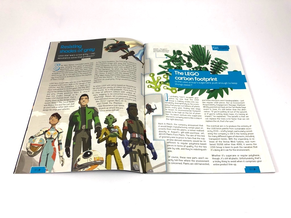 Cela va sans dire, une grande partie de l’équipe de rédaction est issue du site web brickfanatics.com, propriété du groupe Tiro Media Ltd. Dont certains font également partie de la rédaction de Blocks Magazine. Le directeur de la publication est Rob Paton, qui n’est pas moins que le patron de Tiro Media Ltd. Ce qui est très intéressant ici, c’est que la parole est également donnée à de nombreux invités, que ce soit au travers d’interviews ou de papiers dédiés. On y trouve notamment un article de Christian Faber (qui a travaillé 30 ans pour LEGO, et est à l’origine de nombreux thèmes), ou encore des photos de Stuck in Plastic, des spécialistes de la photographie des jouets.