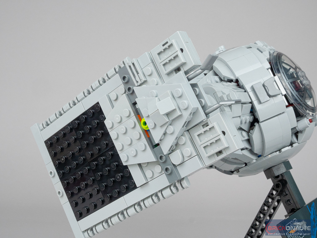 Le designer a fait le choix d’un design avec des tenons apparents sur la partie noire des ailes, contrairement au set 75095 TIE Fighter qui proposait un design « mixte » avec quelques tiles lisses et personnellement, je trouve ça mieux et plus cohérent. Les tranches des ailes sont habilement soulignées d’éléments gris et la partie centrale est joliment décorée avec un niveau de détail tout à fait satisfaisant.