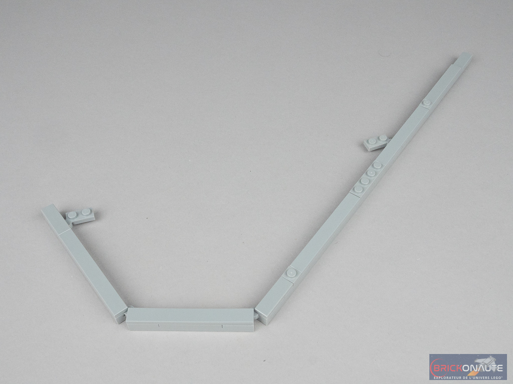 Vous vous en doutez vue la tête du vaisseau, la construction des 4 parties latérales des ailes est identique à la symétrie près. On commence par assembler la partie centrale qui prend déjà la forme définitive, avant de construire de grandes « lignes » grises qui viennent parfaitement trouver leur place sur la tranche grâce à des charnières habilement placées. On remplit ensuite l’intérieur avec des plates et autres wedges adaptées, et il ne reste qu’à attacher ces grands sous-ensembles à la partie centrale des ailes sur les charnières à cliquet. L’angle est maintenu en place grâce à une pièce en angle fixée au dernier moment.