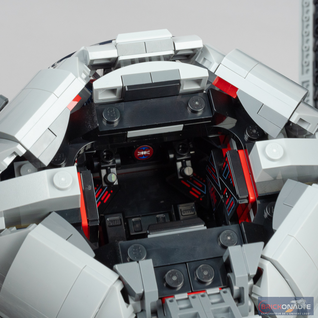 L’intérieur du cockpit, accessible en ouvrant l’écoutille supérieure fixée sur des clips, est plutôt réussi avec ses nombreux écrans de contrôle, ses commandes de pilotage et le joli siège du pilote. Notez d’ailleurs que l’intégralité des autocollants (15 au total, dont un tout petit à coller sur une round tile 1×1) sont à appliquer à l’intérieur et ceux qui le souhaiteront pourront s’en dispenser même s’ils apportent une finition appréciable.