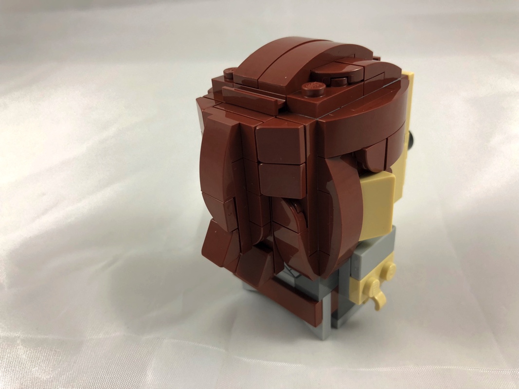 On commence par le haut, puis on s’occupe du visage (très simple, puisque monochrome avec les deux yeux BrickHeadz… et c’est tout). On construit ensuite le côté gauche, l’arrière, et le côté droit. Et c’est là qu’on se rend compte de la richesse du modèle, tant la coiffure est travaillée avec une belle variété de pièces en reddish brown.