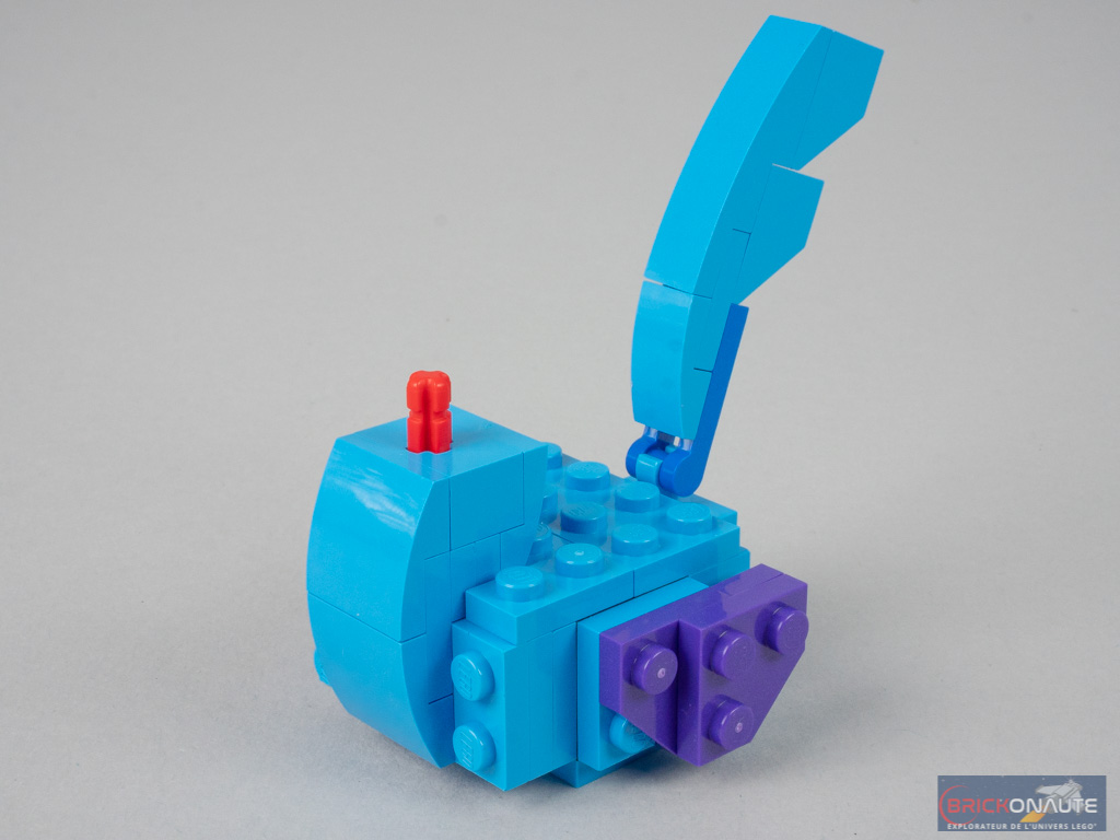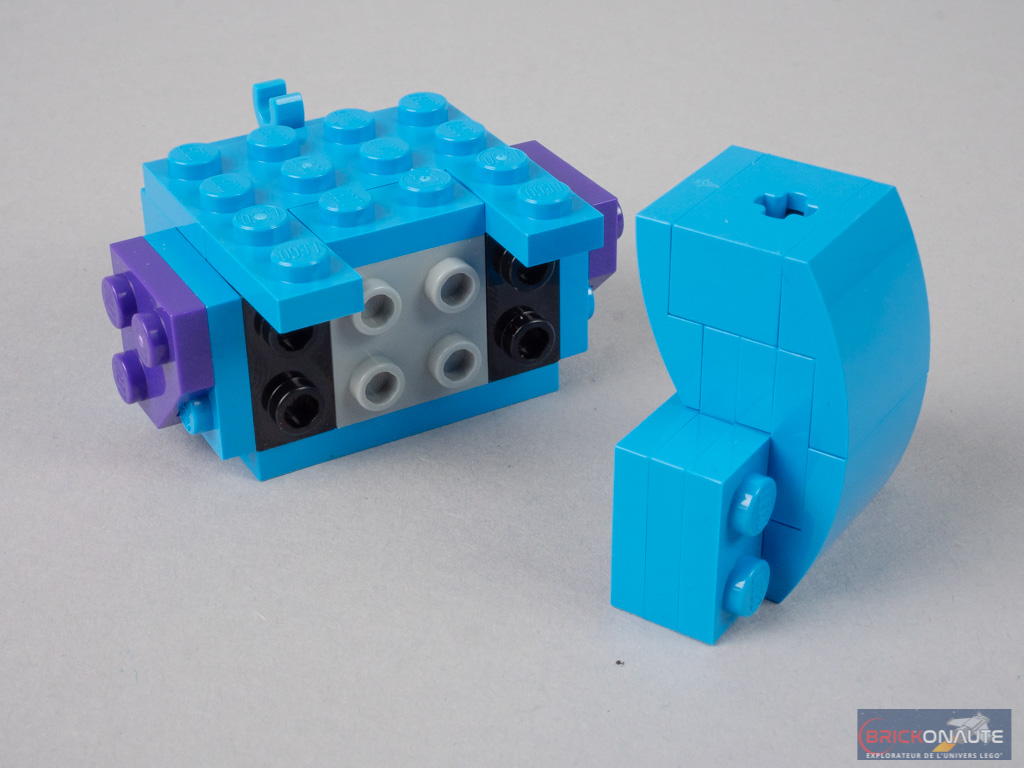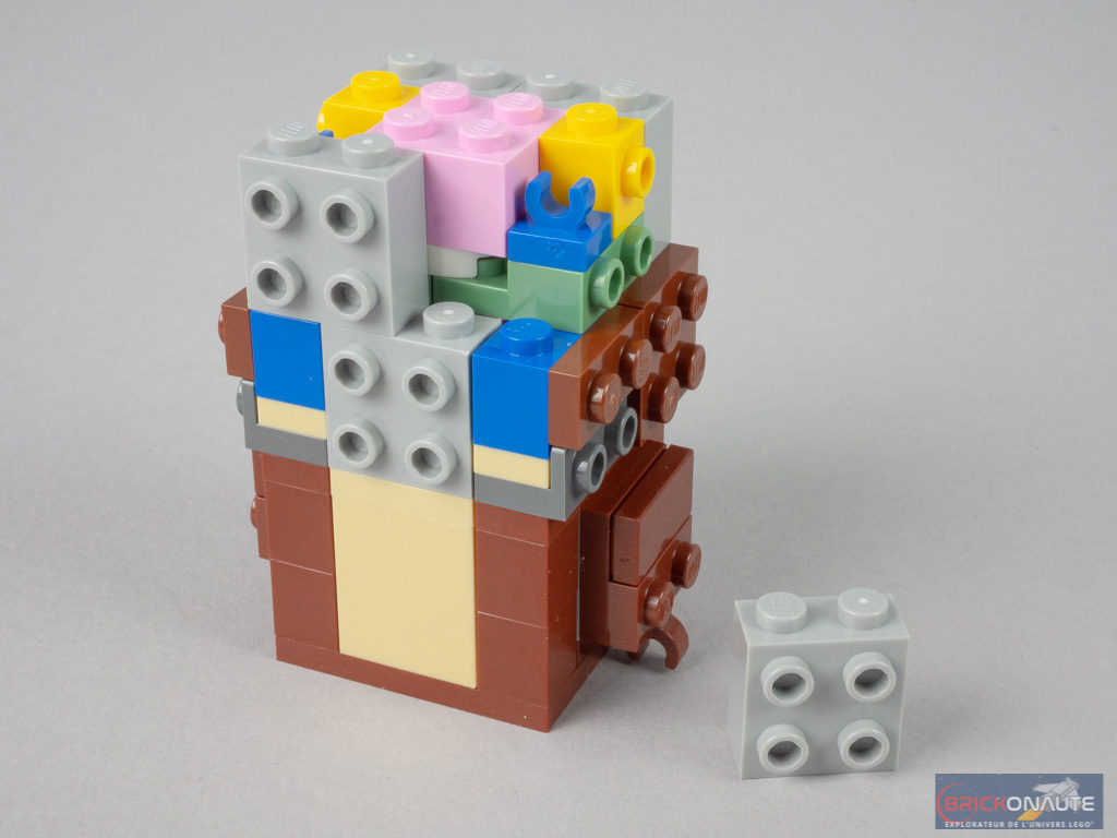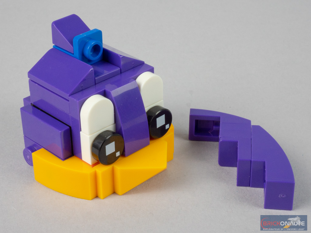 Pour Bip-Bip, la construction est vraiment différente de ce que LEGO nous propose d’habitude dans cette gamme, et c’est compréhensible étant donnée la morphologie du personnage. La structure interne du torse ne fait que deux tenons de profondeur, que l’on vient habiller de part et d’autre pour obtenir cette forme arrondie. La conception du sous-ensemble torse-cou qu’on vient fixer sur l’avant est particulièrement bien pensée. La structure interne de la tête est également très intéressante, puisque LEGO a choisi, et c’est une bonne chose, de ne pas reprendre la structure habituelle de 4x4x4 tenons – mais plutôt 2x3x3. La grande crête est habilement reproduite avec deux slopes superposées, fixées sur un petit bracket.