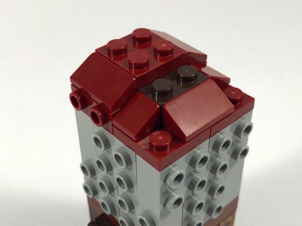 La robe d’Albus Dumbledore couvre complètement ses jambes. Nous commençons donc par assembler ladite robe. Une « tour » de 3×4 tenons est construite, avec des tenons sur l’une des faces. On termine la robe en assemblant diverses tiles sur une plate 4×4, puis en ajoutant les bras eux aussi décorés d’une tile tampographiée.