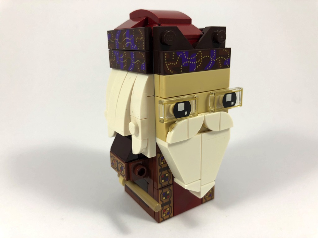 Les deux côtés du visage sont symétriques, et constitués d’un mélange simple et efficace de différentes pièces blanches. En revanche, l’arrière de la coiffure est nettement plus travaillé avec les longs cheveux de Dumbledore. On finit son chapeau, puis on lui donne sa baguette magique avant de fixer les deux tiles transparentes tampographiées avec les yeux habituels des BrichHeadz. Ceux qui trouvaient les lunettes carrées du set 41597 – Go Brick Me trop imposantes seront ravis d’obtenir ces deux pièces qui proposent une alternative intéressante.