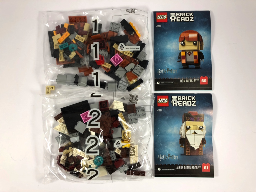 Nous aurons donc eu les trois formats de boîtes avec les BrickHeadz issues de l’univers Harry Potter. Après Hermione, vendue à l’unité, et Harry Potter & Hedwig, au format intermédiaire, nous trouvons le format habituel des BrickHeadz vendues en « duo-packs » pour une vingtaine d’euros. Le code couleur est identique aux deux autres sets. Sur l’avant, les deux personnages sont présentés de face, Ron Wealsey portant le numéro 60, et Albus Dumbledore le 61. A l’arrière, ils se font face et sont présentés de trois-quarts.