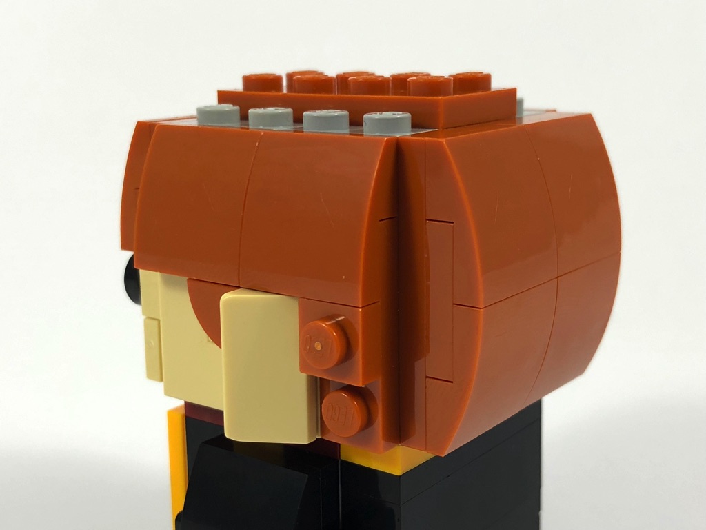 La structure de la tête est classique. On construit ensuite la face, où une large frange de 2 tenons tombe sur le front du personnage. Les deux côtés sont symétriques, on appréciera les oreilles qui se détachent au milieu d’une chevelure dense. Les amateurs de dark orange seront comblés, puisqu’il s’agit de la couleur retenue par LEGO pour représenter les cheveux roux. L’arrière de la tête est très simple, et composé de 4 slopes. On termine Ron en lui ajoutant ses jambes, en lui donnant sa baguette magique, et en finissant sa coiffure par la partie supérieure de la tête, elle aussi constituée de 4 slopes.