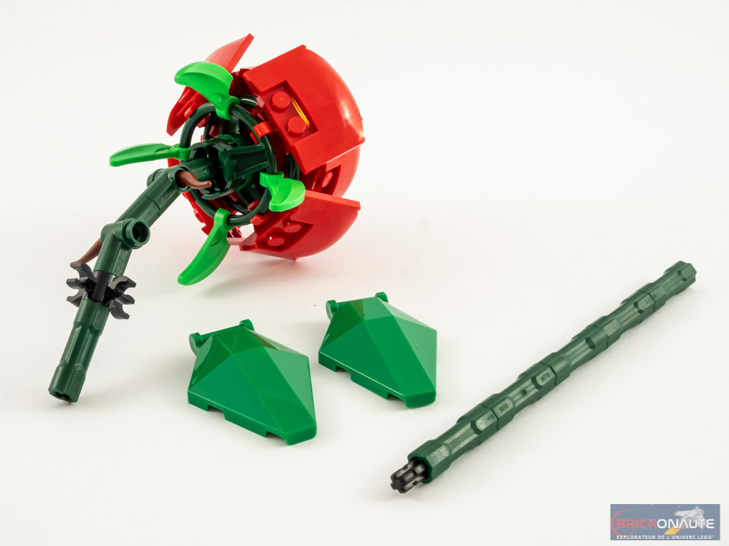 Comme on pouvait s’y attendre, la construction des roses est similaire à celles vues dans le set 10280 Flower Bouquet. Ce sont en effet deux volants verts superposés, sur lesquels sont clipsés les pétales représentés par des capots de voiture. Elles ne sont cependant pas tout à fait identiques : si les roses du set 10280 offraient deux formes de pétales différentes, ce n’est pas le cas ici. La base de ces pétales est également recouverte d’une tile dans le set 10280, finition qu’on ne retrouve pas non plus. Le pistil est identique, mais est ici de la même couleur que les pétales. Quant à la tige, seules les feuilles changent – et personnellement je trouve celles-ci plus adaptées que les ailes de ptéranodon.