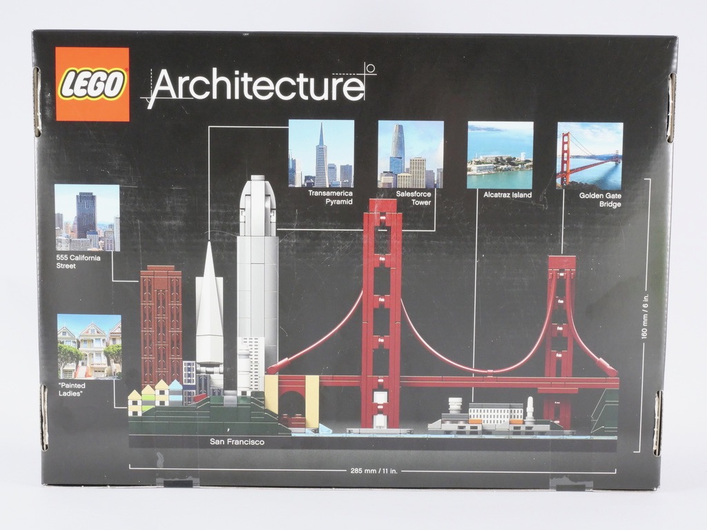 C’est toujours agréable de retrouver ces boîtes de la gamme LEGO Architecture, avec une finition qui se veut premium dans une gamme qui, il faut bien l’avouer, reste plutôt chère. Sur l’avant de la boîte, notre set est mis en valeur sur le fond noir habituel de la gamme. Au dos, nous le retrouvons avec une série de photos des bâtiments représentés dans la skyline : les « Painted Ladies », le 555 California Street, la Transamerica Pyramid, la Salesforce Tower, l’île d’Alcatraz et, naturellement, le Golden Gate Bridge.
