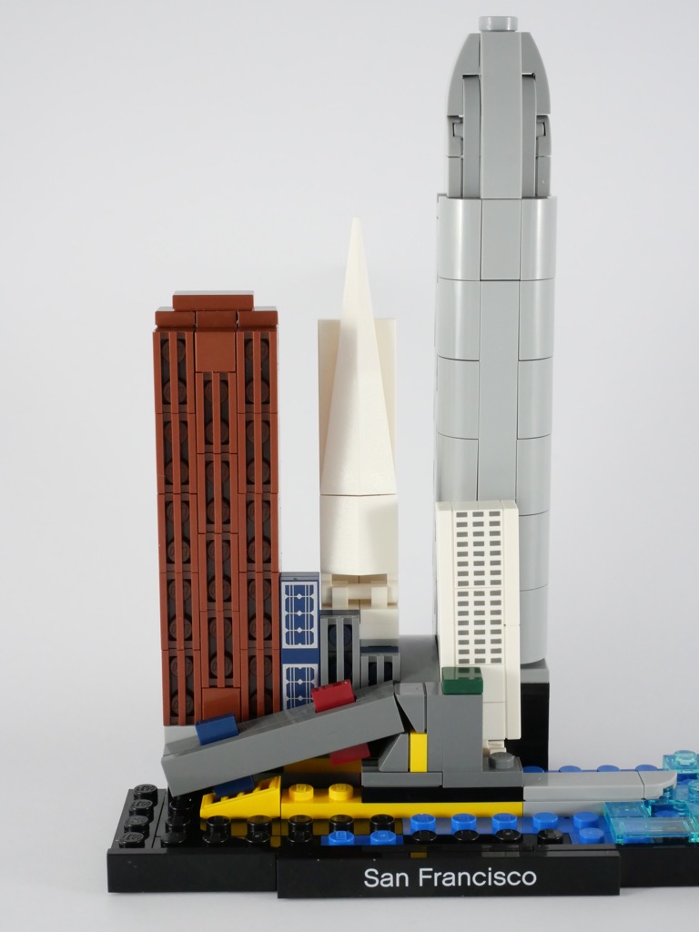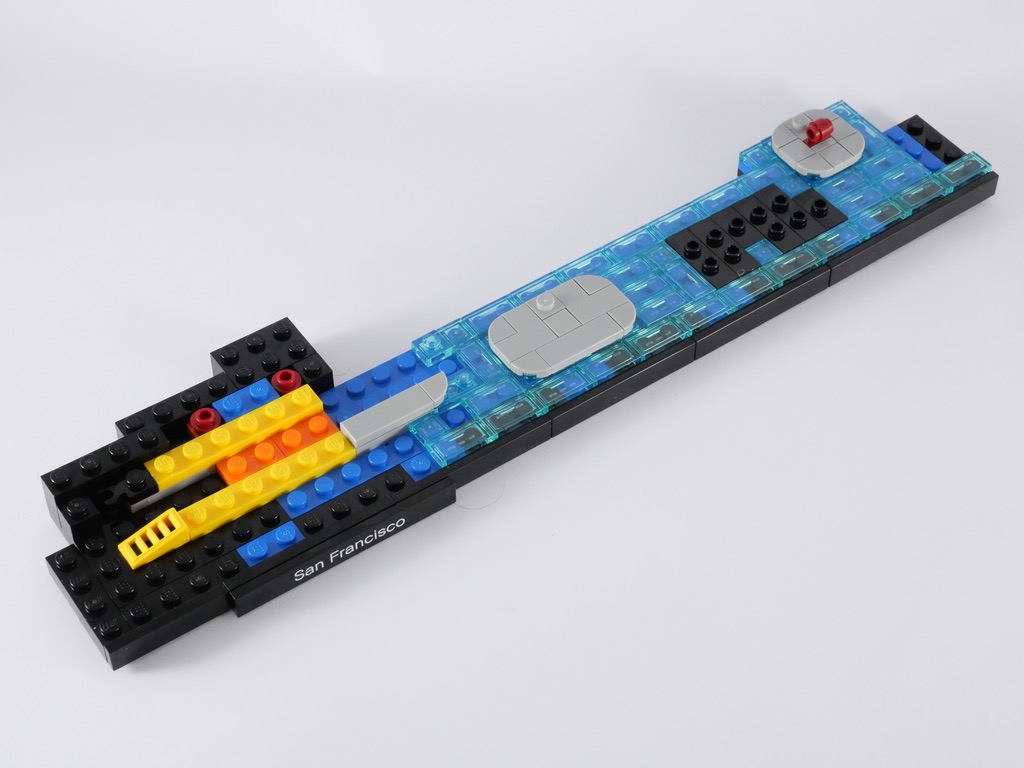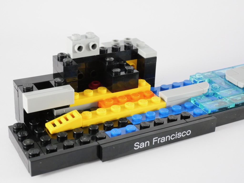 Le design est également un modèle du genre. Avec l’alternance des formes et des couleurs, l’ajout des rues et des petites voitures pour donner un peu de vie à l’ensemble et des bâtiments relativement fidèles à leurs homologues réels, la recette fonctionne. On regrettera quelques « approximations » inhérentes à l’échelle retenue, mais globalement il n’y a pas grand chose à redire. Et le Golden Gate Bridge réalisé avec cette perspective forcée est vraiment du plus bel effet. La vue « de dos » reste satisfaisante même si le set n’est pas conçu pour être exposé de cette manière.