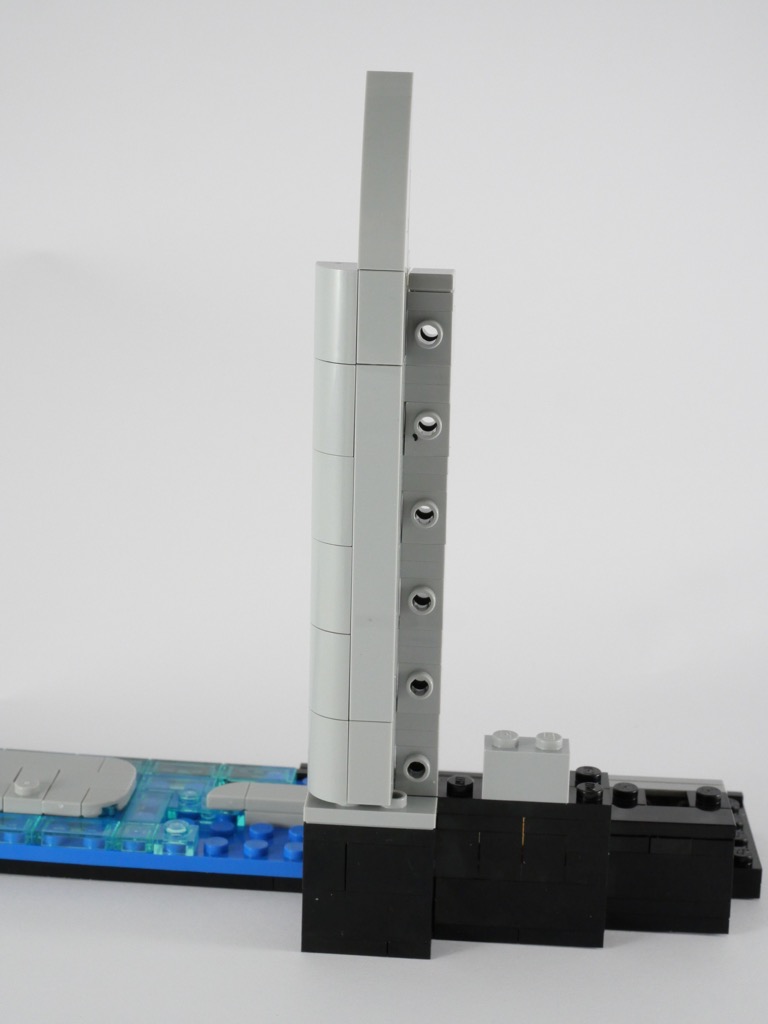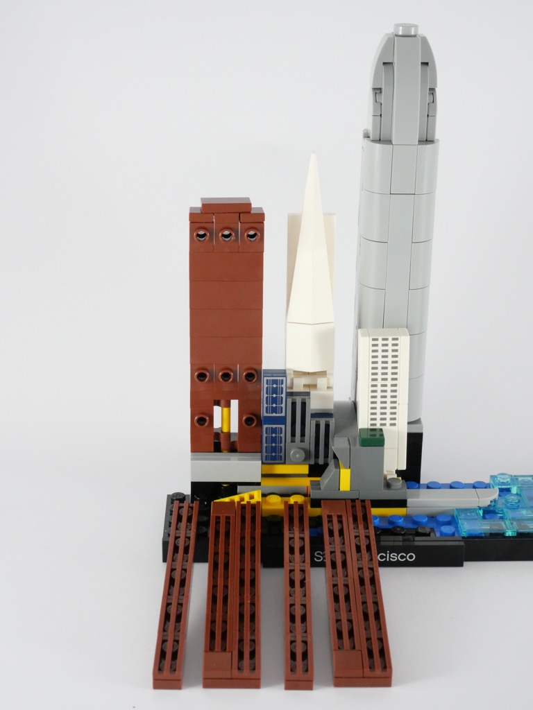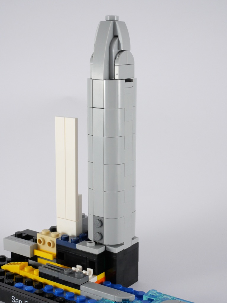 La conception de la Transamerica Pyramid est radicalement différente. Son âme n’est épaisse que d’une tile, et dont les deux faces sont habillées d’une pièce pointue fixée à la base de la tour sur des clips. Vous l’aurez compris, le dos est forcément moins joli. On notera les deux Plate Special 1 x 2 with Angular Extension and Flexible Lime Tip blanches, pour le moment exclusives à cette boîte.