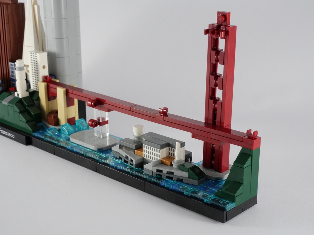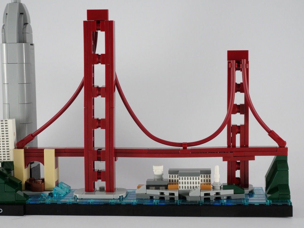 Il est temps de passer à la « pièce maîtresse » du set : le célèbre Golden Gate Bridge. Sa conception est également très intéressante. On assemble une première pile, avant de construire le tablier. On construit alors une seconde pile, plus grande et plus épaisse que la précédente. La construction s’achève avec l’ajout des câbles servant à supporter le poids du tablier, également de longueur différentes. Le tout permet d’obtenir une perspective forcée vraiment réussie.