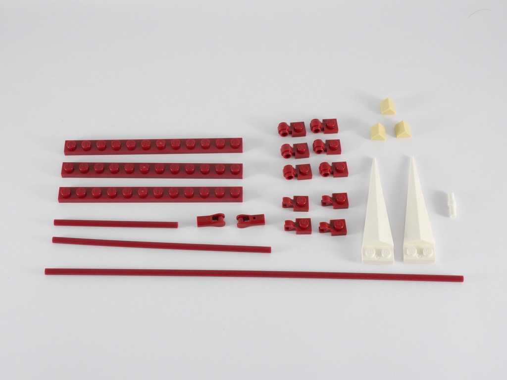 À l’intérieur, nous trouvons 4 sachets de pièces numérotés de 1 à 3, une barre (Hose, Rigid 3mm D. 26L / 20.8cm) couleur dark red, et une notice d’instructions de 128 pages pour 119 étapes de construction. Comme d’habitude, les premières pages sont dédiées aux divers éléments représentés dans la skyline.