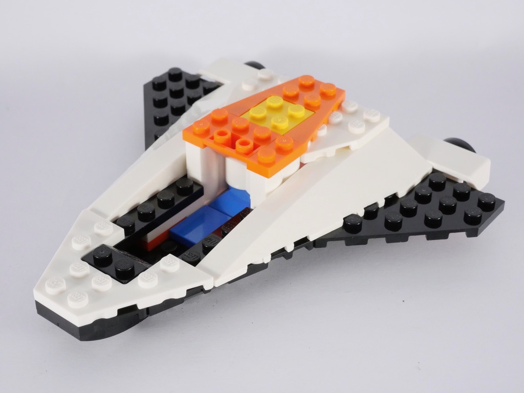 La construction du vaisseau est assez simple, comme on pouvait s’en douter. Cette boîte est destinée aux plus jeunes, comme l’indique la mention « 5+ » sur la boîte. On commence donc par assembler la « base » du vaisseau, auquel on ajoute des ailes puis des réacteurs, avant de s’attaquer au cockpit. Ceci terminé, on passe à la partie blanche et orange avec la construction des deux flancs puis de la « cale » qui peut recevoir le satellite. On termine avec un peu d’aménagement intérieur au cockpit, par la verrière, et enfin par les volets clipsés au bout des ailes pour leur donner leur taille définitive.