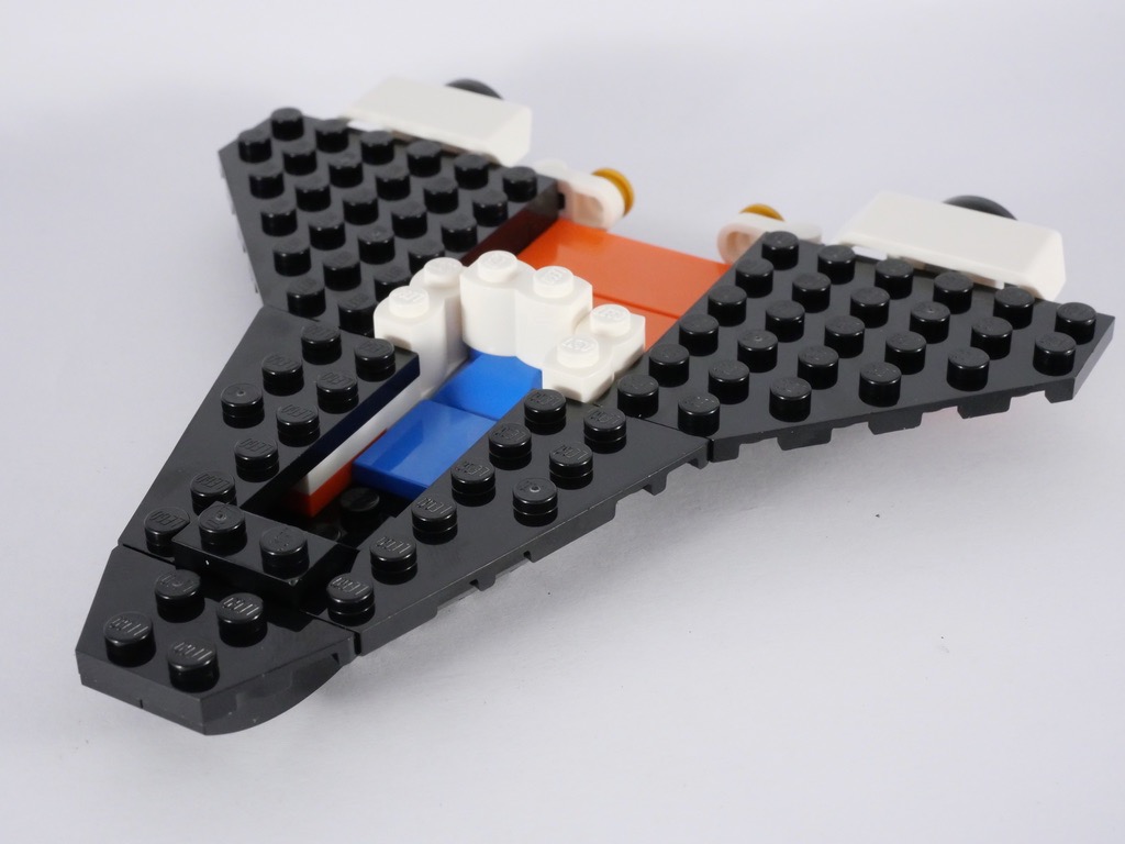 La construction du vaisseau est assez simple, comme on pouvait s’en douter. Cette boîte est destinée aux plus jeunes, comme l’indique la mention « 5+ » sur la boîte. On commence donc par assembler la « base » du vaisseau, auquel on ajoute des ailes puis des réacteurs, avant de s’attaquer au cockpit. Ceci terminé, on passe à la partie blanche et orange avec la construction des deux flancs puis de la « cale » qui peut recevoir le satellite. On termine avec un peu d’aménagement intérieur au cockpit, par la verrière, et enfin par les volets clipsés au bout des ailes pour leur donner leur taille définitive.