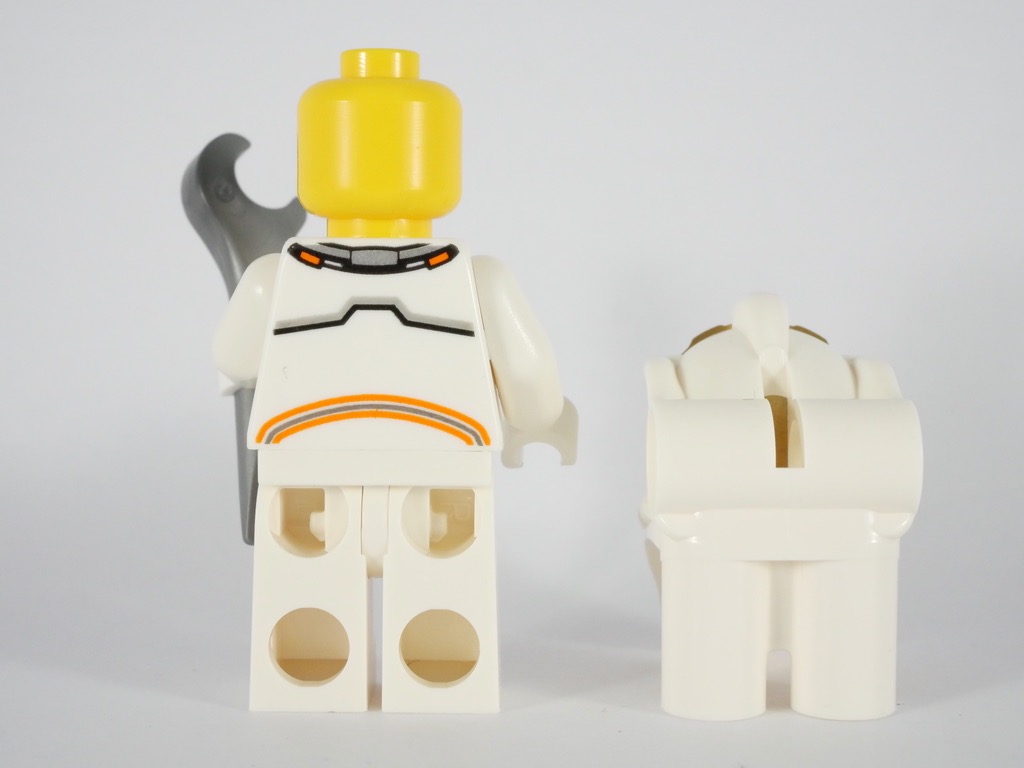La minifig fournie est identique à l’astronaute trouvé dans le set 60227 – Lunar Space Station, dont vous pouvez retrouver mon test ici. La combinaison qu’il porte est une nouveauté 2019, on la retrouve jusqu’ici dans 5 sets différents. On voit sur le torse le petit logo « signature » de cette série LEGO City basée sur l’espace. Cette combinaison est joliment tampographiée, y compris sur la ceinture et le torse. Pour compléter la combinaison extra-véhiculaire, l’astronaute porte un énorme casque à la visière dorée, attaché aux bouteilles d’air dans son dos. Une minifig plutôt réussie pour la mission qui lui est confiée : réparer un satellite lors d’une sortie extra-véhiculaire.