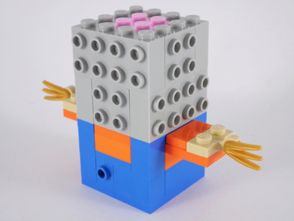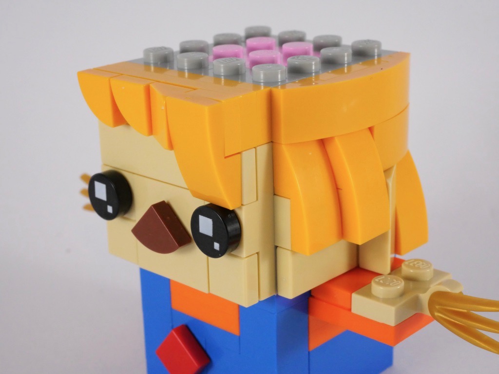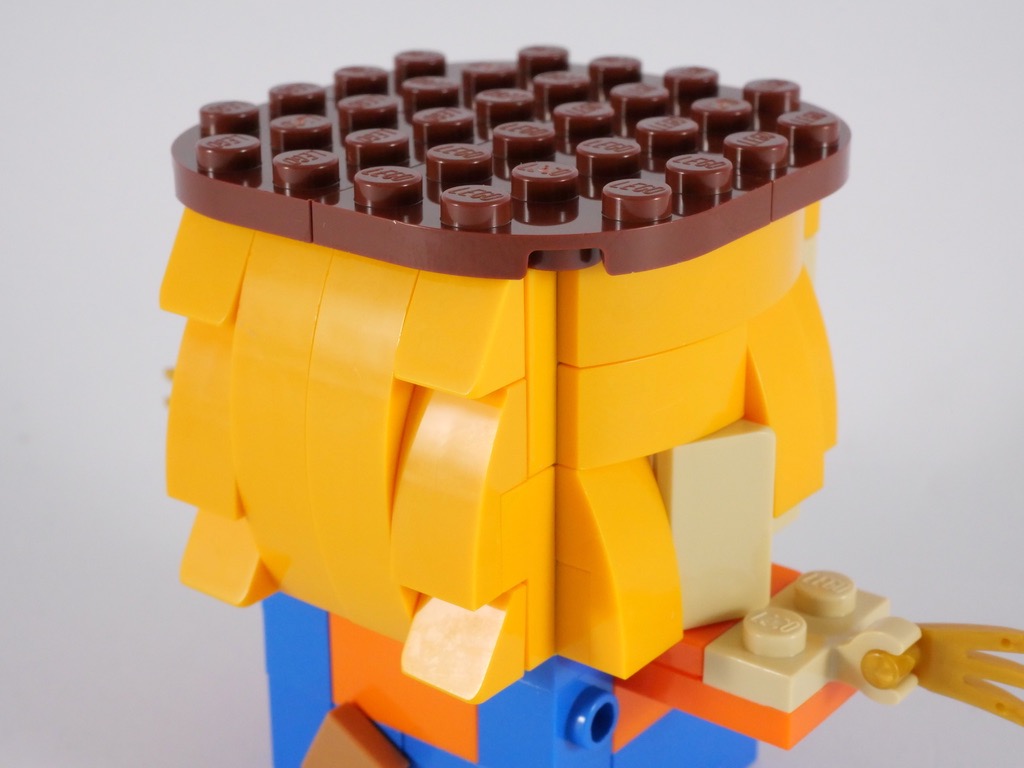 La construction est classique pour une BrickHeadz, à quelques variations près. On notera ainsi les deux grands bras « à plat » et la branche au dos qui permet de les soutenir. L’autre variation réside dans le fait que le personnage repose sur un poteau en bois, plutôt que sur ses pieds : il est donc légèrement plus grand que les BrickHeadz habituelles. Pour le reste, la construction n’est pas très dépaysante : on construit le torse, puis la tête que l’on « habille » sur ses différentes faces, avant d’ajouter les pieds et le chapeau. On termine avec le socle d’exposition.