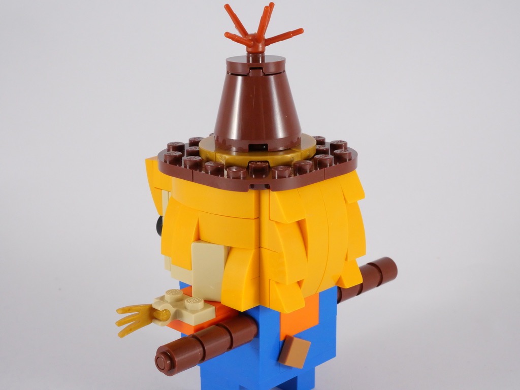 Le résultat est très satisfaisant, tous les éléments sont joliment réalisés. La salopette bleue présente quelques reprises de couleur, et la coiffure est très détaillée. Y compris à l’arrière de la tête, ce qui est suffisamment rare chez les BrickHeadz saisonnières pour être souligné. Le socle n’est pas en reste, avec sa citrouille et ses carottes, et ses clôtures de travers fixées par des clips. Deux griffes dorées figurent la paille dépassant des manches. Seul petit regret : vu de dos, les branches qui soutiennent les bras ne semblent pas soutenir grand chose.