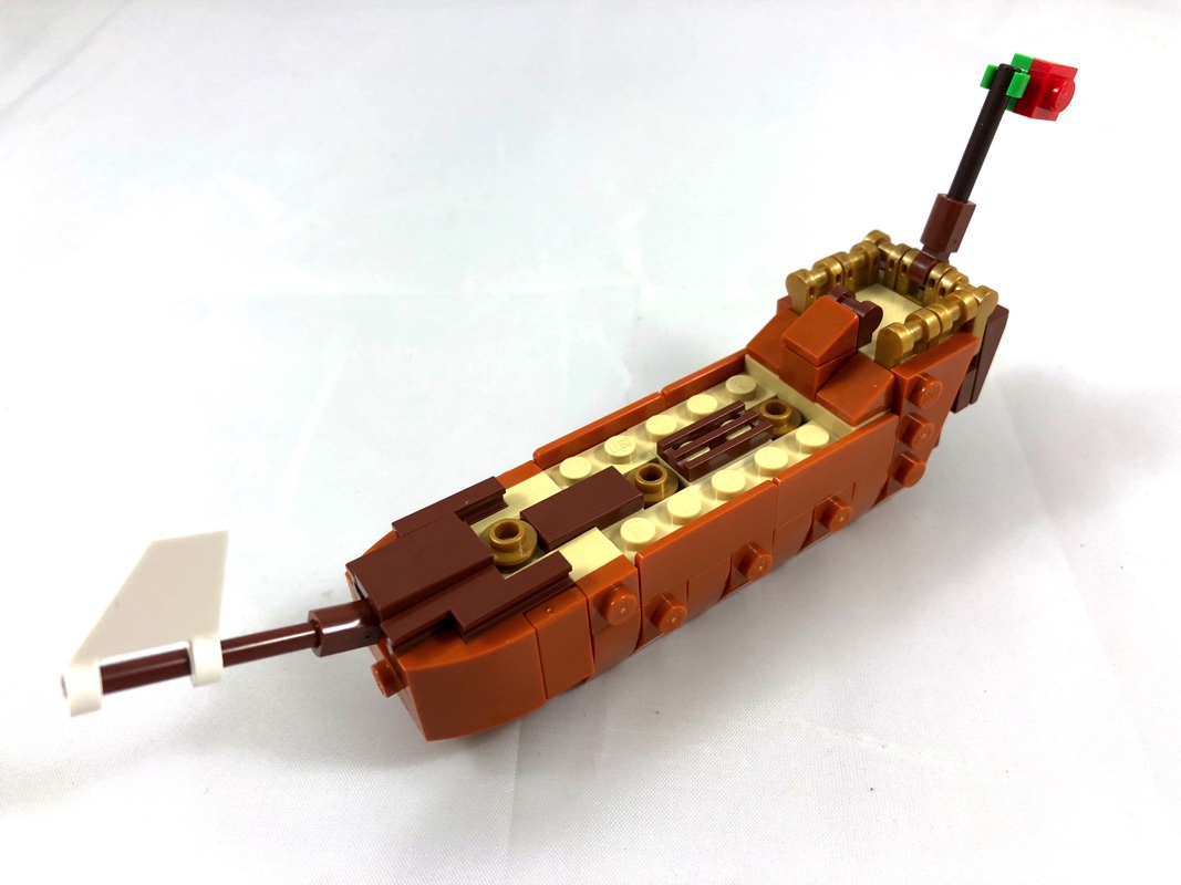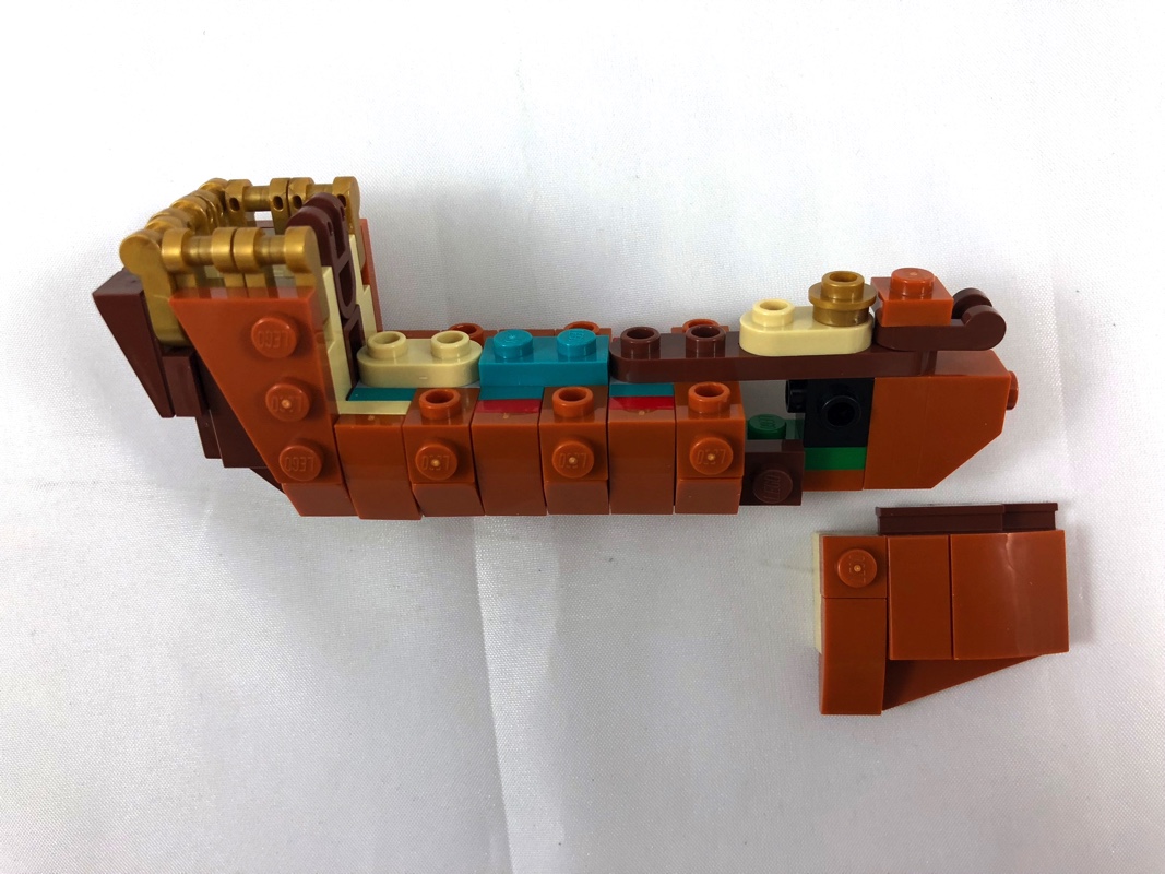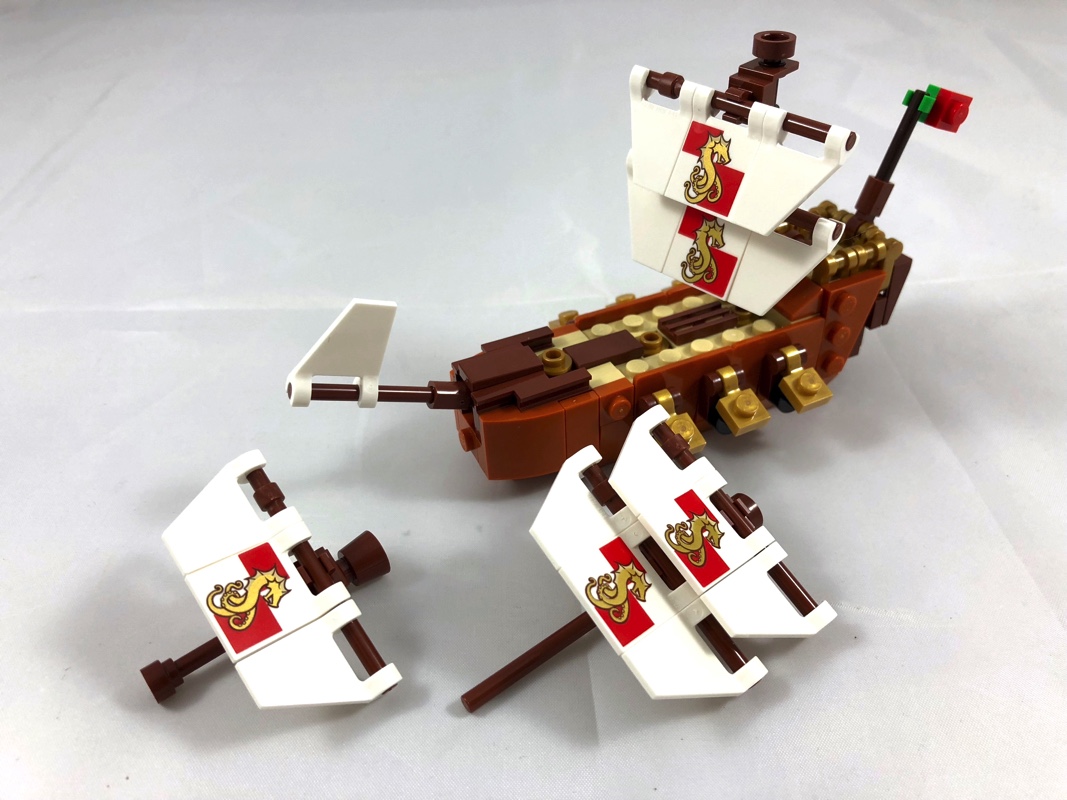 Comme je vous l’expliquais plus haut, nous allons commencer par assembler le bateau avec les pièces contenues dans la première série de sachets. Sur une base d’un tenon de large, on rapporte au fur et à mesure les différents éléments de la coque, à commencer par le château. On habille ensuite un côté, puis l’autre, avec une grande variété de pièces d’une couleur plutôt rare : dark orange. Le château est en reddish brown, et surmonté d’une balustrade en pearl gold. On ajoute le pont, couleur tan, avant de construire le pavillon arrière et la proue du bateau. On termine en ajoutant les 3 mâts, dont deux sont identiques et le dernier légèrement plus petit. Ils sont tous ornés des voiles tampographiées d’un motif de Léviathan, couleur or sur fond rouge et blanc.