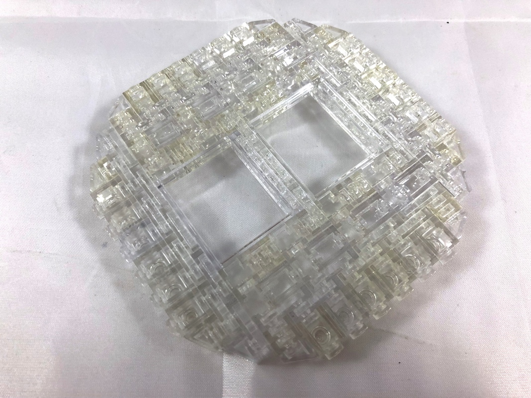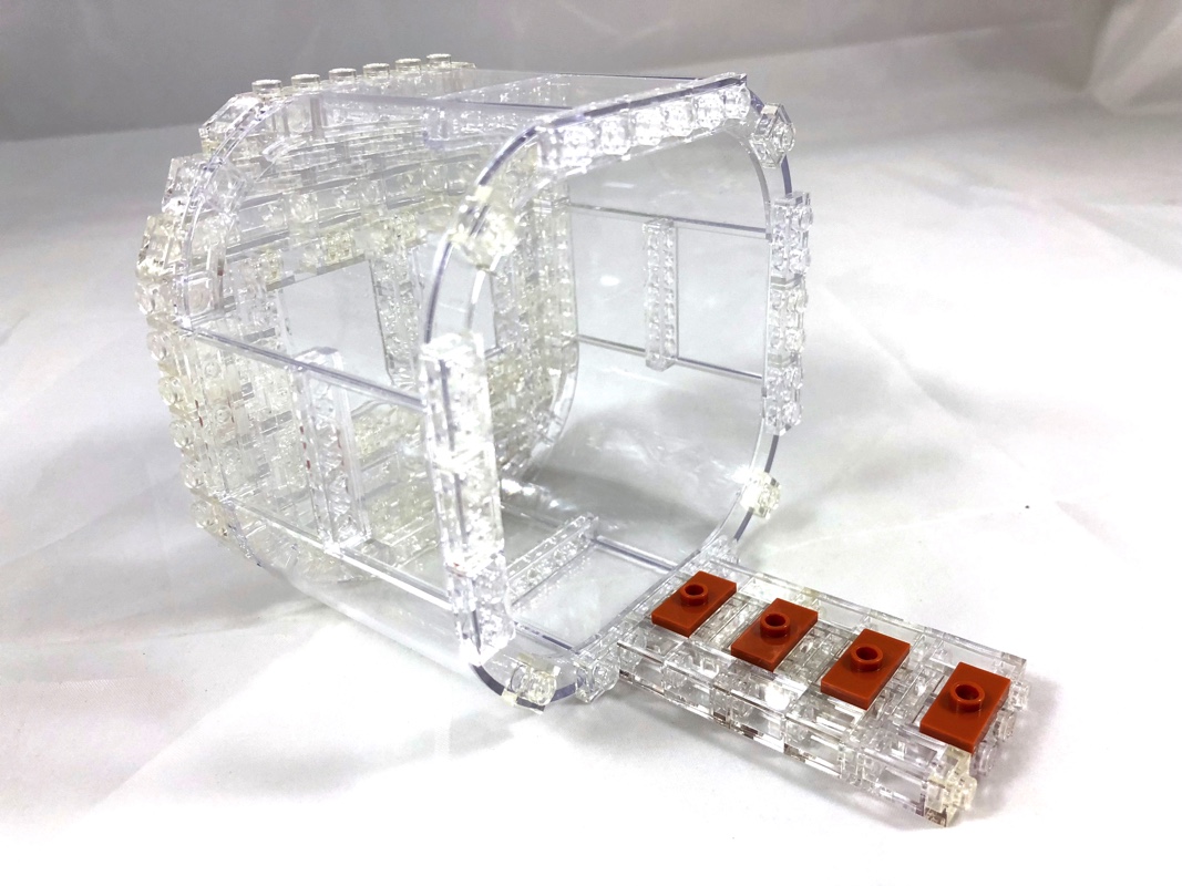 Vient maintenant l’assemblage de la bouteille, à commencer par le fond. Ce fond est composé exclusivement de pièces transparentes, avec en son centre deux panels 4×3, et pour le reste un assemblage de briques 1×1 (avec ou sans headlight), de plates (1×1 et 1×2) et de slopes 1×1. Le fond terminé, on construit le reste de la bouteille, composé pour l’essentiel d’autres panels 4×3 et de quarts de cylindre, toujours en trans clear. 4 jumpers en dark orange sont installés au fond, afin de pouvoir y fixer le bateau. Une fois le bateau fixé, on continue la construction de la bouteille, sans sa partie haute.
