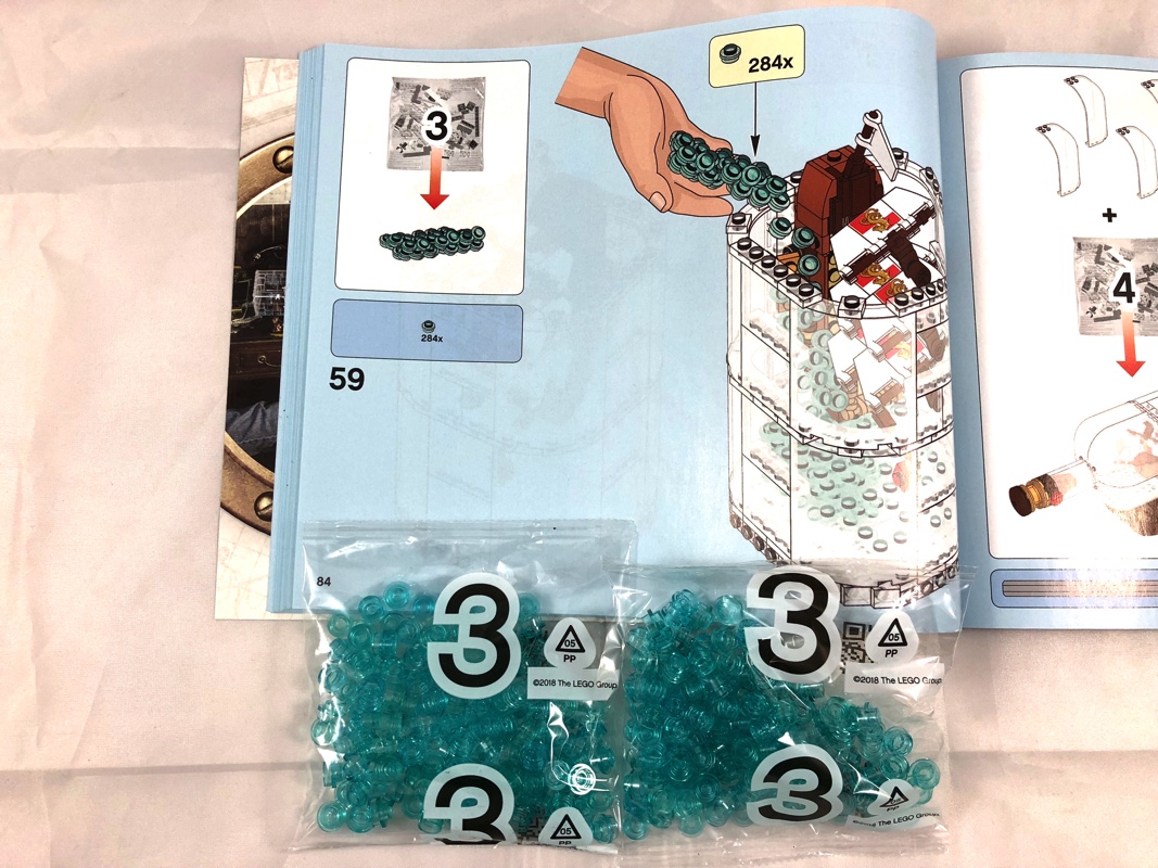 Les sachets portant le numéro 3 ne contiennent que des round plates 1×1 en trans light blue, que l’on jette en vrac au fond de la bouteille pour modéliser l’eau. Je dois avouer ne pas avoir vérifié que les sachets contenaient bien les 284 pièces annoncées.
