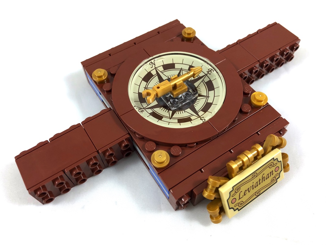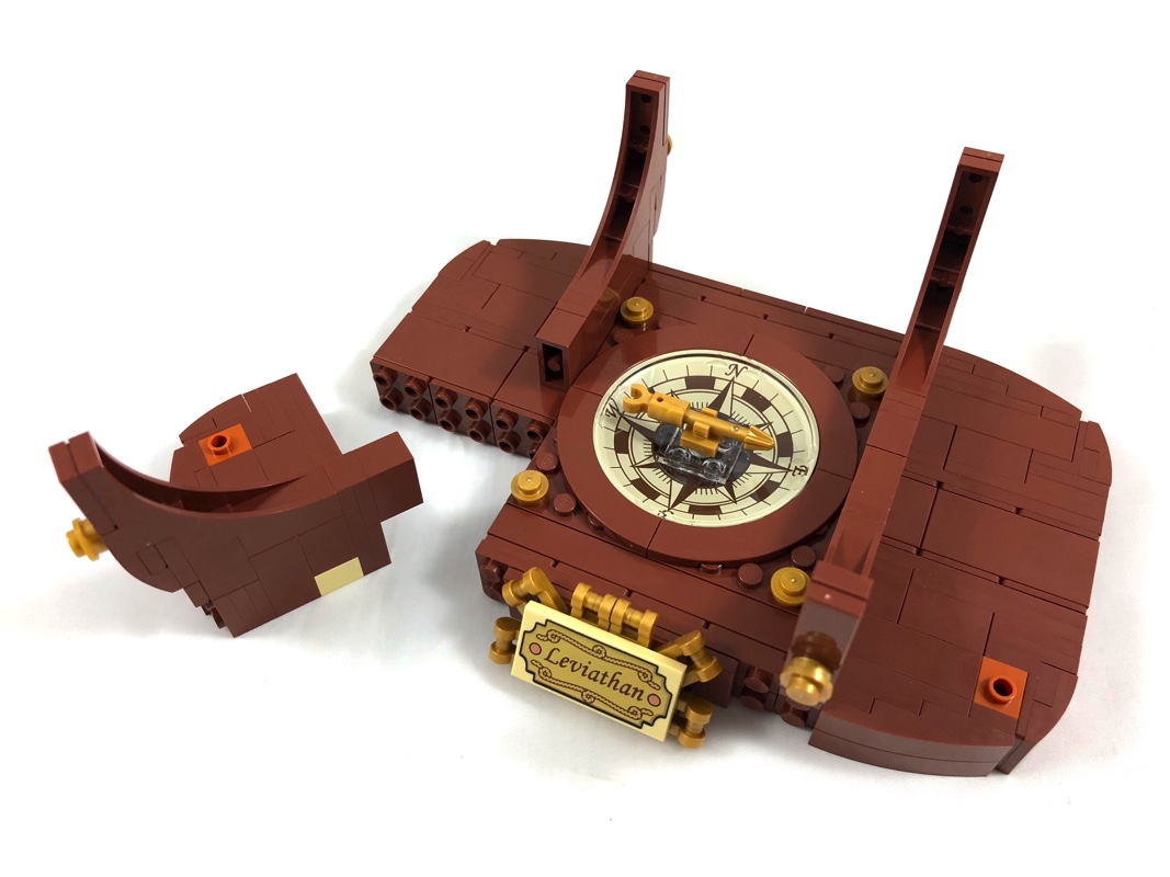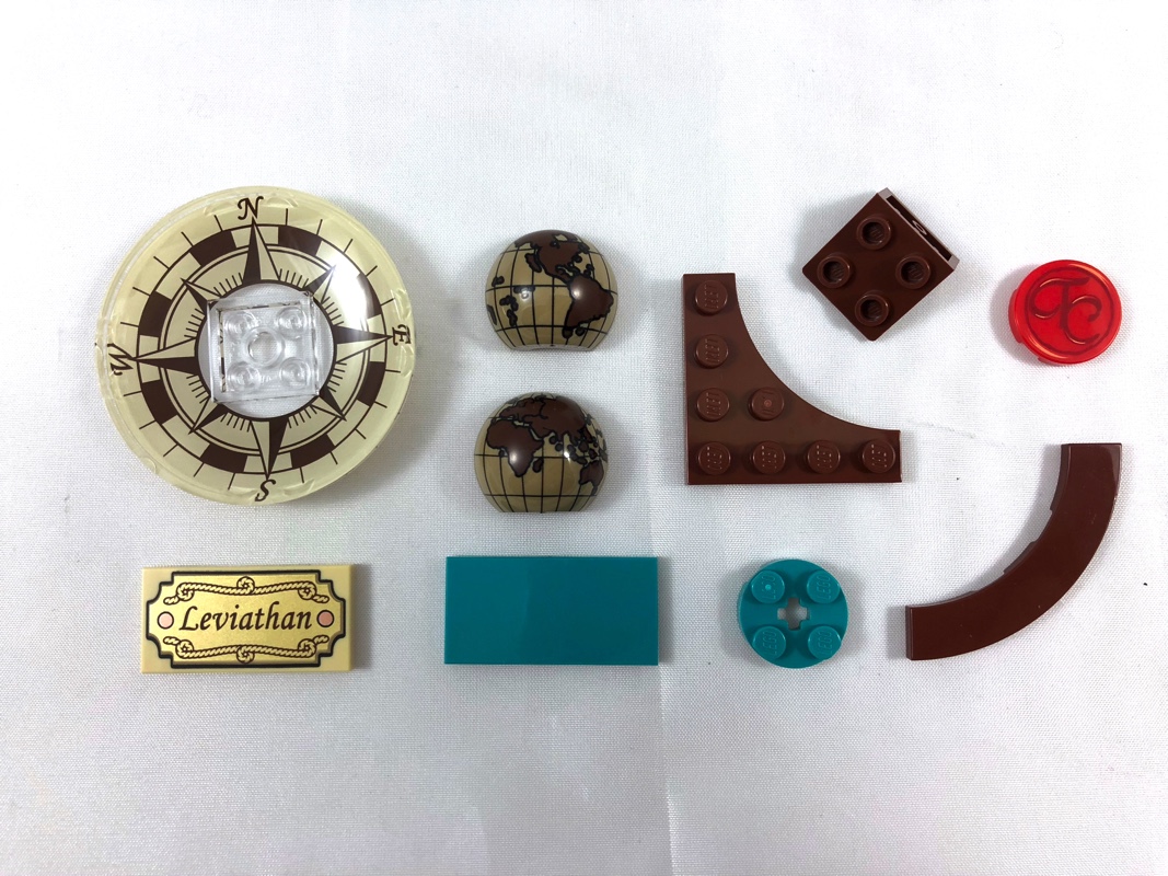 - 1 Tile 2 x 4 tampographiée couleur or sur fond tan, avec le nom du bateau (Leviathan), exclusive