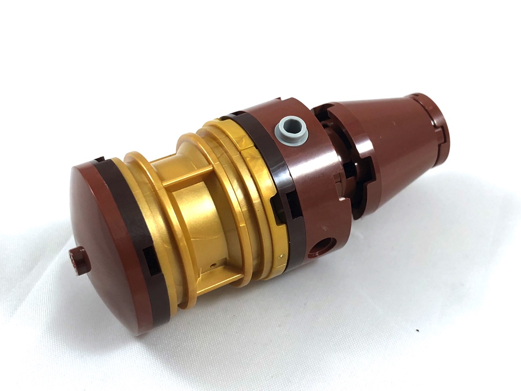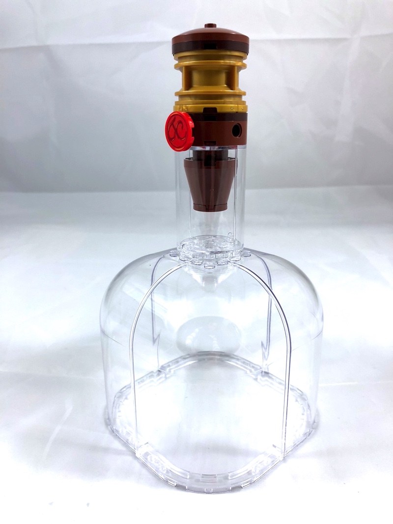 On attaque maintenant la 4ème et dernière série de sachets. On commence par construire le bouchon, en fait un assemblage de pièces rondes et coniques enfichées autour d’un axe Technic. On notera l’utilisation astucieuse d’une grande jante en pearl gold. On ajoute le sceau tampographié, avant de construire le goulot à l’aide de deux demi-cylindres. On ajoute enfin les 4 énormes Trans-Clear Panel 6 x 6 x 9 Corner Convex with Curved Top, avant d’ajouter l’ensemble sur le bas de la bouteille, et de secouer cette dernière pour répartir les 284 round plates.