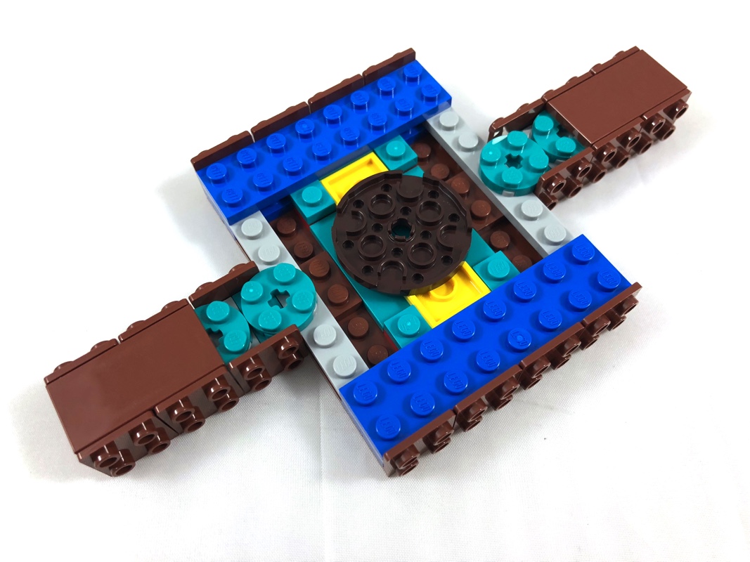 Dernier élément à construire : le support. On commence par construire une « croix » disposant de brackets sur les côtés et du compas tampographié en son centre. On notera que l’aiguille de ce dernier est axée sur un pin Technic, qui permet de l’orienter comme on le souhaite. On habille ensuite l’avant du support avec le nom du bateau, et quelques pièces en pearl gold. Puis on y ajoute quatre éléments composés notamment d’un quart de cercle pour supporter la bouteille, et de nombreuses tiles et slopes qui font qu’aucun tenon n’est apparent une fois l’assemblage réalisé. On termine en construisant les deux mappemondes, elles aussi orientables comme on le souhaite.