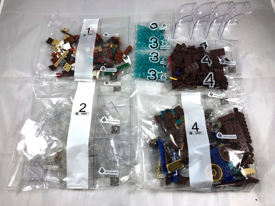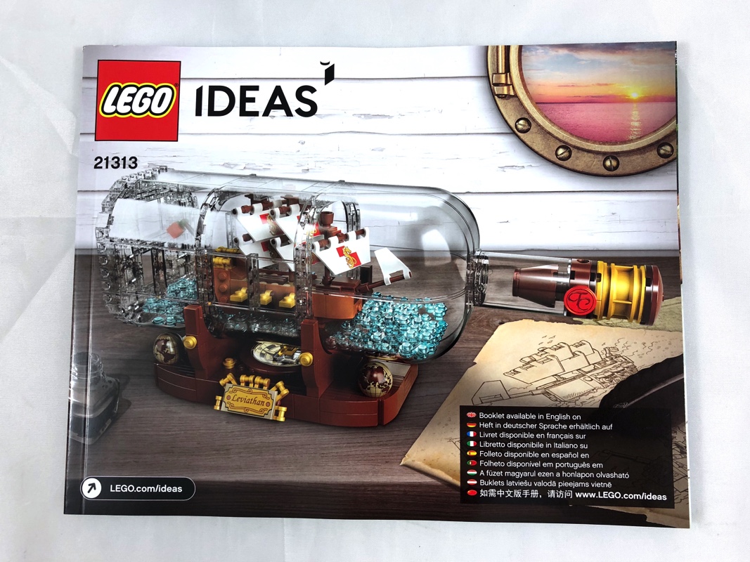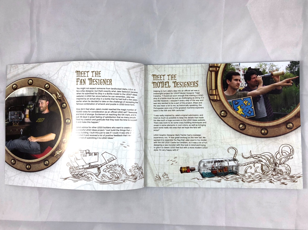 A l’intérieur, nous trouvons une notice d’instructions de 156 pages, à l’intérieur de laquelle les deux premières sont consacrées au fan designer ayant atteint les 10 000 votes sur la plateforme LEGO Ideas (Jake Sadovich) et aux designers de chez LEGO ayant transformé le projet initial en modèle LEGO (Tiago Catarino et Mark Tranter). En plus de cette notice, 6 sachets de pièces numérotés de 1 à 4 contiennent les 962 pièces du modèle. Pour faire simple, le premier sachet sert à construire le bateau, le deuxième la bouteille (sans son bouchon), les sachets portant le numéro 3 contiennent les studs en trans blue représentant l’eau, et les deux sachets numérotés 4 servent à terminer la bouteille et à construire le support.