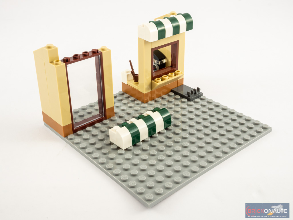 La construction de la boulangerie – ou plutôt de sa façade – est plutôt rapide. On commence par construire un petit comptoir avec une machine à café et une caisse enregistreuse, puis on assemble les murs et la vitrine avec sa porte d’entrée. On termine avec la partie supérieure : deux stores, une toiture verte et une enseigne avec un bretzel (un sticker). On achève alors l’aménagement intérieur avec une caisse contenant deux baguettes, et deux bretzels disposés près du comptoir.