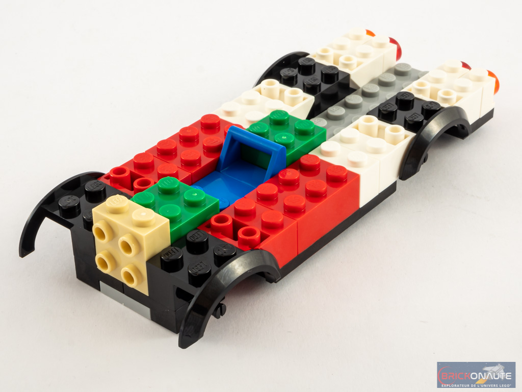 On commence la construction par la décapotable. Celle-ci se base sur un gros châssis (Wheel Bearing 6X10X1, W/ Mini Snap comprenant déjà les pins destinés à recevoir les roues. La construction est simple et quasi symétrique entre l’avant et l’arrière, à l’exception de l’habitacle. Une fois la caisse assemblée, on construit deux sous-ensembles qui se fixent sur des brackets à l’avant et à l’arrière. Remarquez ici les feux brick built et les sorties d’échappement, c’est simple mais le résultat est très convaincant.