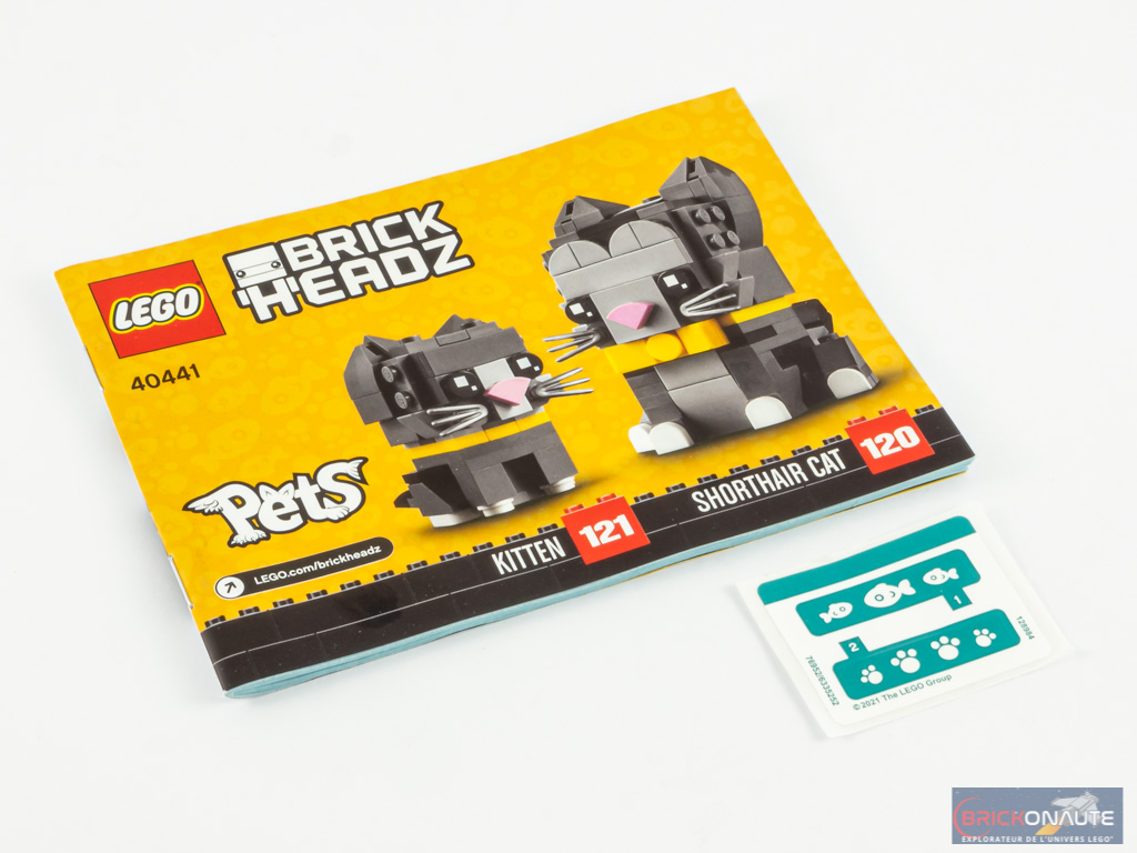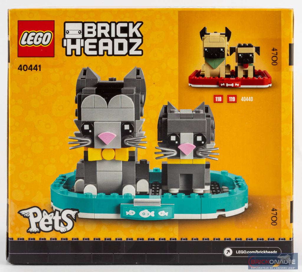 La boîte reprend le format auquel LEGO nous a habitués pour les « duos » de BrickHeadz. Les deux animaux nous sont présentés sur la face avant, sans leur panier. Le chat et son petit portent respectivement les numéros 120 et 121 dans la collection LEGO BrickHeadz. Dans le coin inférieur gauche, un petit logo « Pets » stylisé laisse présager qu’il s’agit ici d’une nouvelle collection, qui sera déclinée à l’avenir avec une grande variété d’animaux : on retrouve des ailes d’oiseau et une queue de poisson dans ce petit logo.