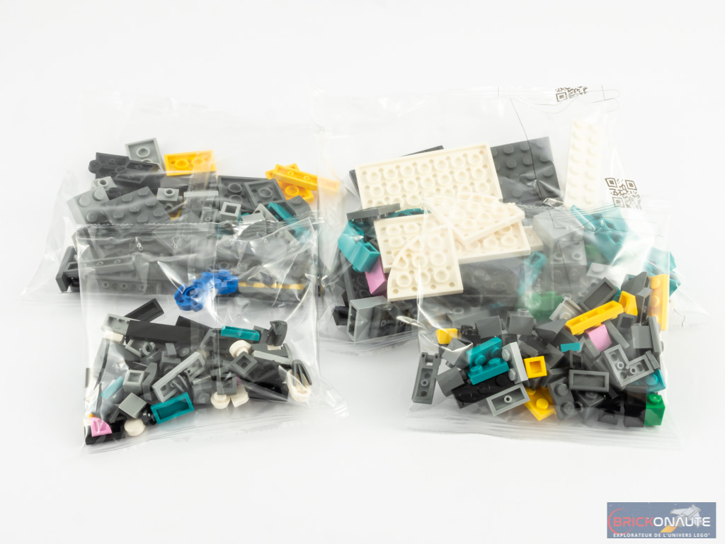 A l’intérieur, nous trouvons 4 sachets de pièces non numérotés, une notice d’instructions de 76 pages et une mini planche de 2 autocollants. L’inventaire de 250 pièces ne compte pas d’éléments particulièrement rares ou spécifiques.