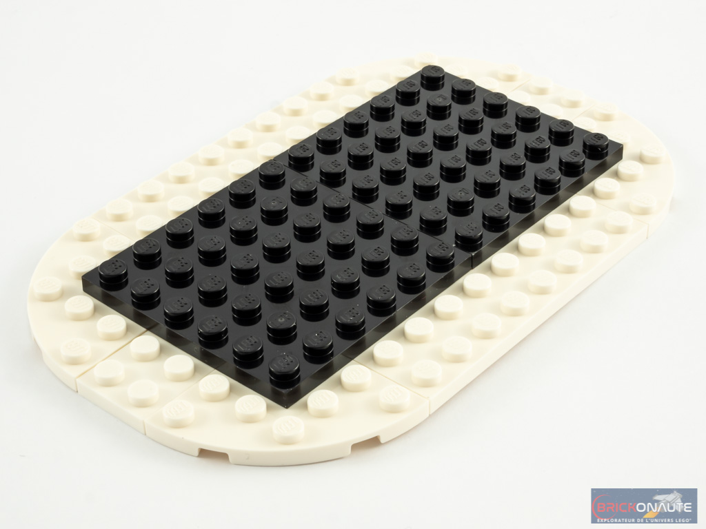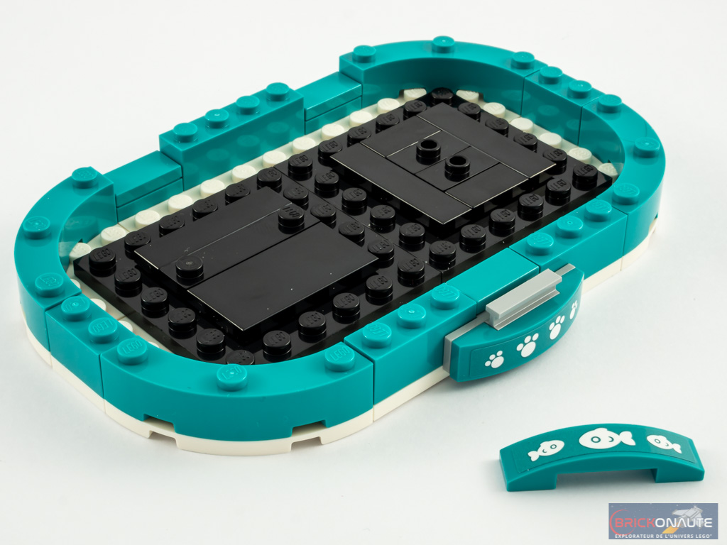 Le support d’exposition de nos BrickHeadz est ici plus original que d’habitude. La construction de ce panier est vite expédiée : un socle blanc surmonté de deux plates noires, entourées d’une rangée de briques couleur teal. Des jumpers permettent la fixation des deux chats dans le panier. Sur l’avant, on choisira l’un ou l’autre des autocollants : des poissons, ou des pattes de chat. J’ai opté pour la seconde solution, mais LEGO fournit les deux slopes nécessaires : vous pourrez donc changer si vous le souhaitez.